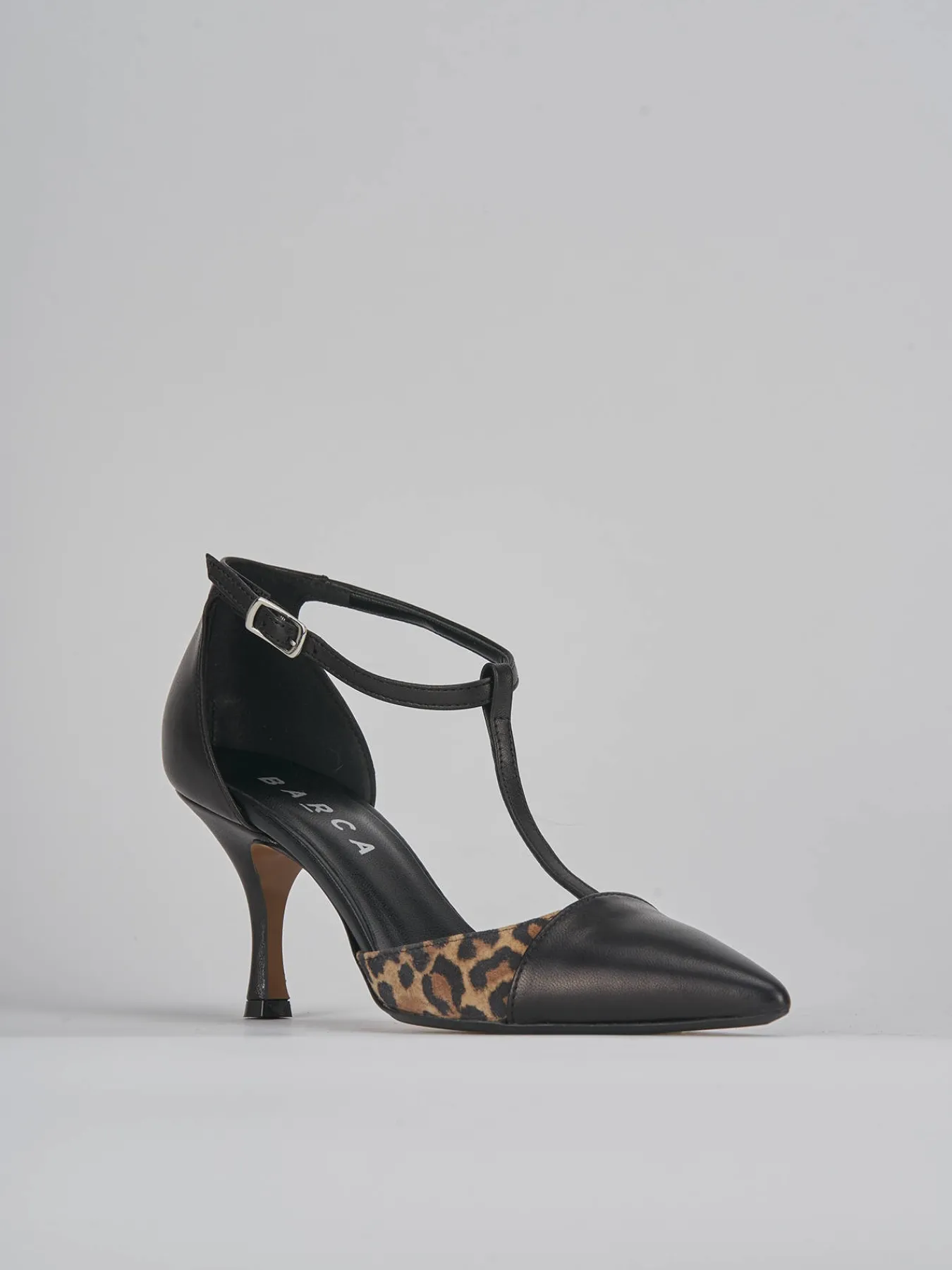Bebè tacco 7 cm fondo in gomma e soletto interno in vera pelle. Tomaia in morbida pelle, punta sfilata, puntale con riporto in cavallino stampato leopardo per un tocco fun ai tuoi look. Fascia a ‘T’ con fibbia regolabile in caviglia e tacco cool.