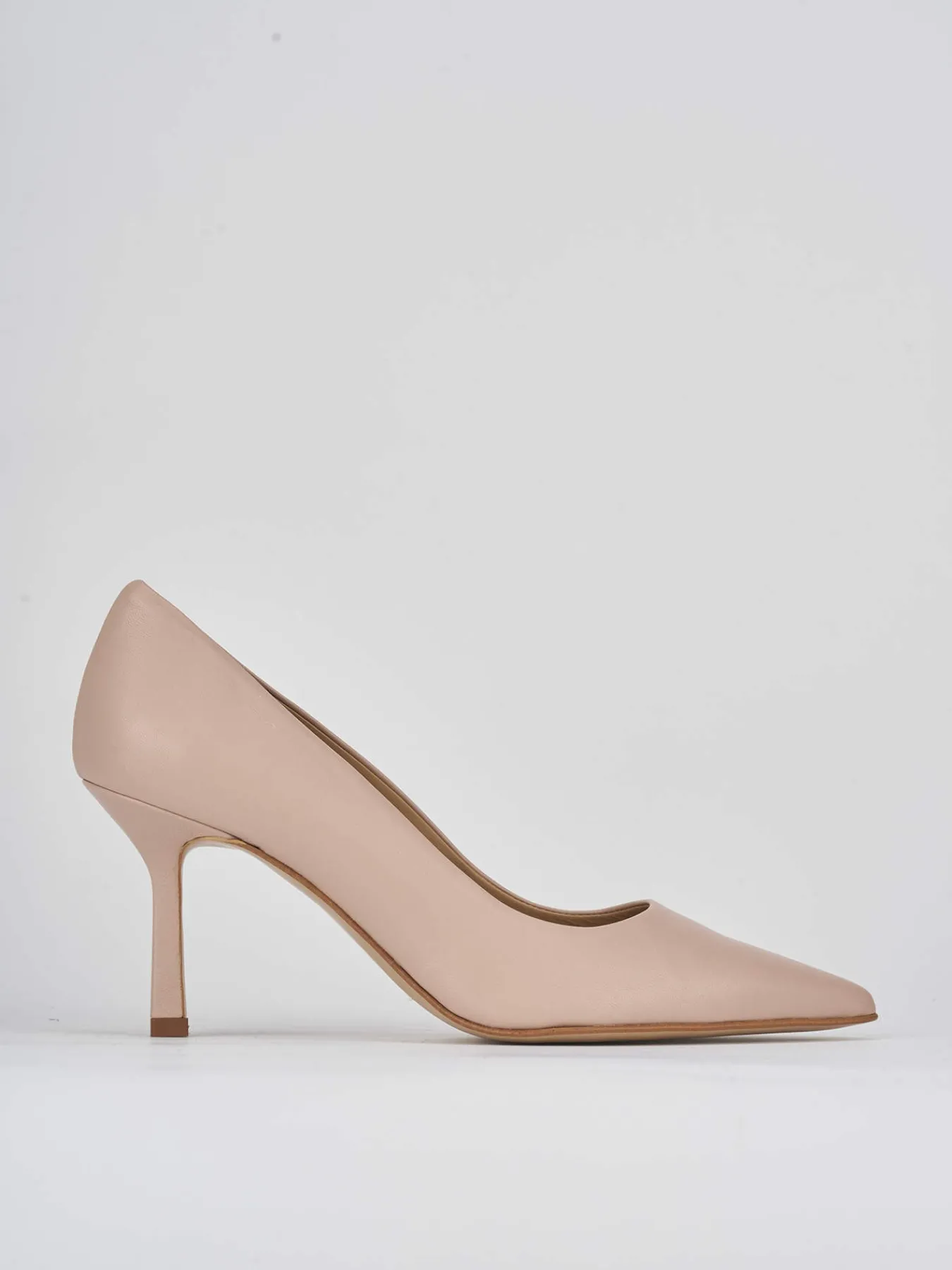 decolte’ tacco 7 cm fondo in cuoio e soletto interno in vera pelle. tomaia in morbida pelle nappata, punta sfilata, comodo tacco rocchetto. dalle linee semplici e pulite, adatto in ogni tua occasione.