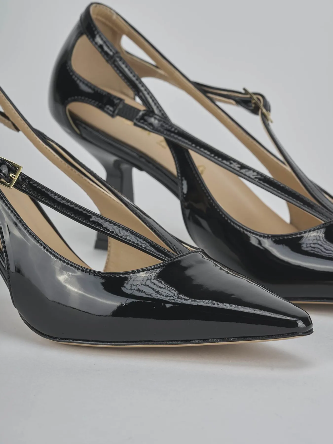 Decolte’ tacco 7 cm fondo in leggerissima gomma e soletto interno in vera pelle. Tomaia in morbida pelle effetto verniciato, punta sfilata, scollo a ‘U’, due cinturini incrociati con fibbia e tacco rocchetto. Aperto lateralmente per un look fierce.
