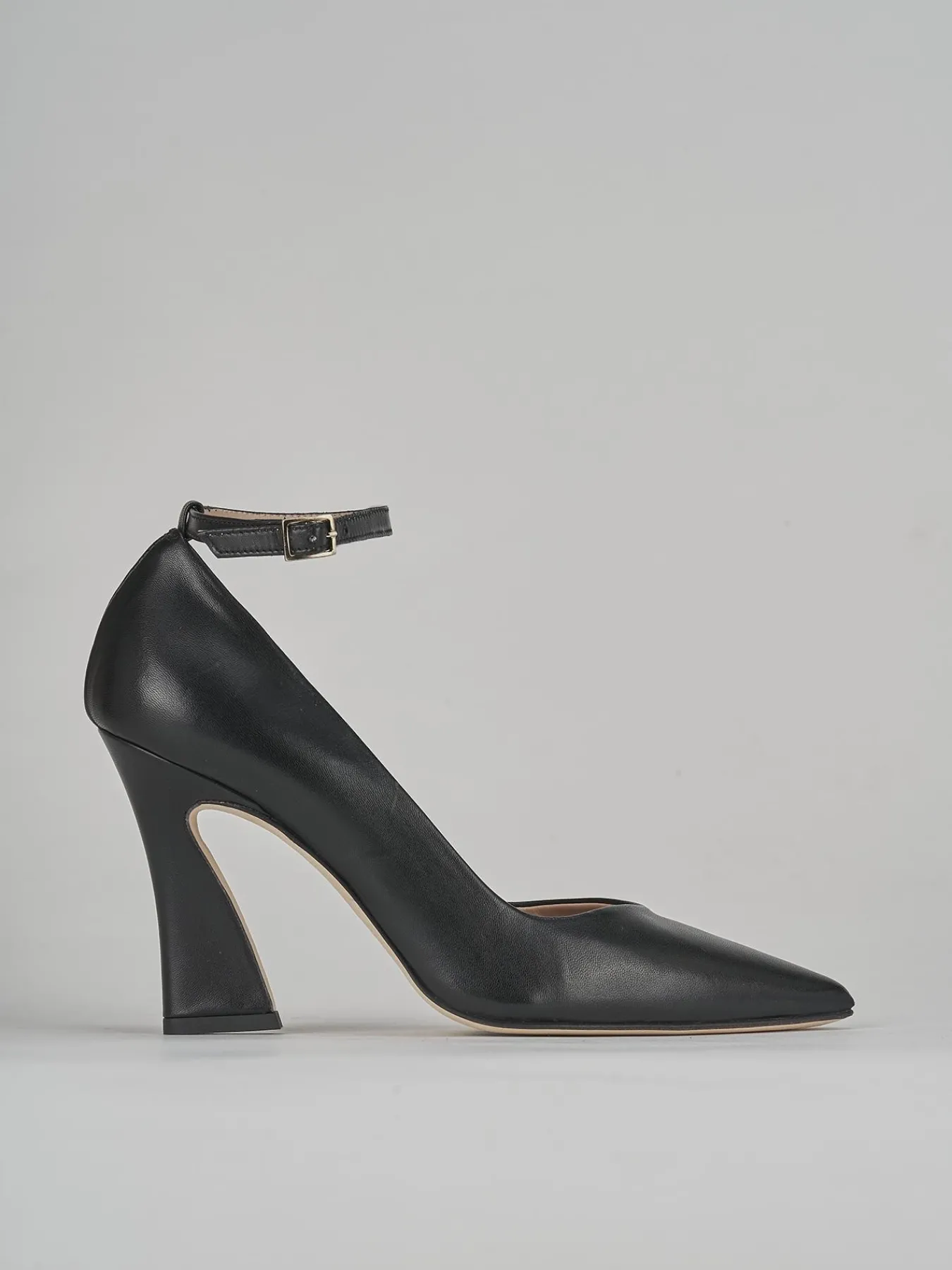 bebe tacco 9 cm fondo in cuoio e soletto interno in vera pelle. tomaia in morbida pelle nappata, punta sfilata, particolarissimo tacco rocchetto e cinturino regolabile per un look cool.