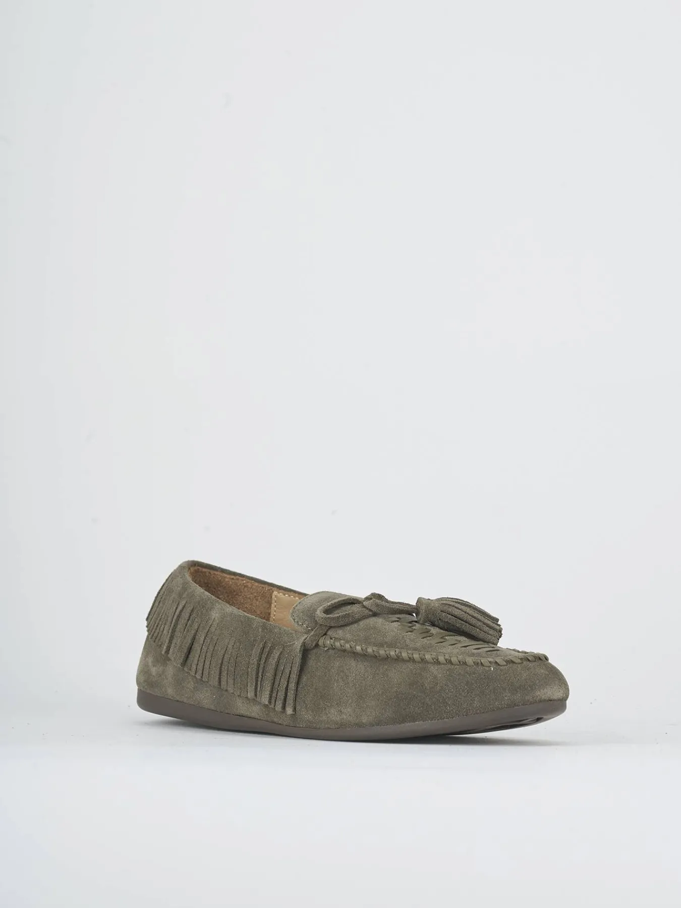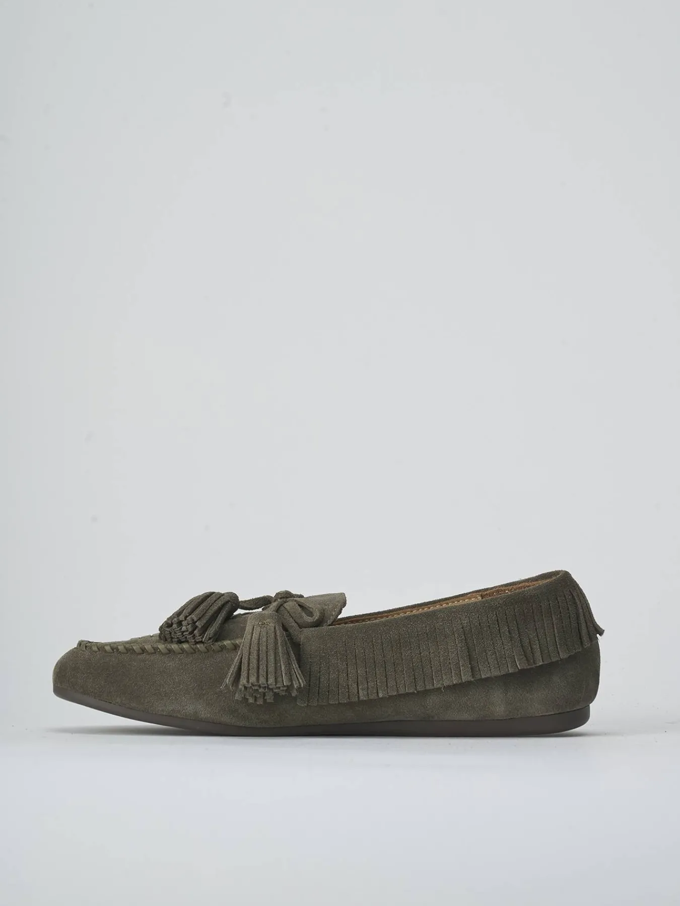 Realizzati in morbido camoscio, questi mocassini presentano dettagli di frange sul bordo superiore, aggiungendo un elemento di stile sofisticato.