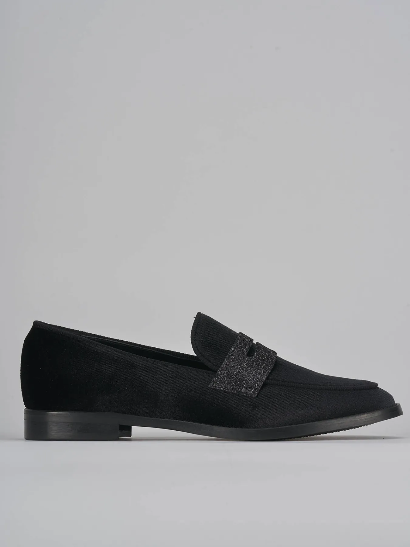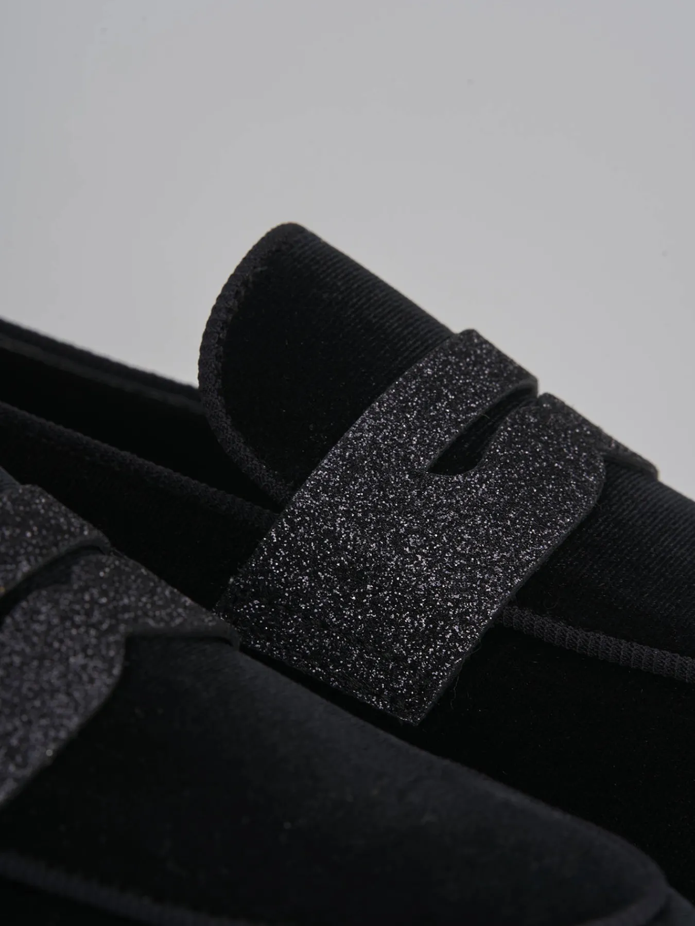 mocassino tacco 2 cm fondo in gomma e soletto interno in vera pelle. tomaia in morbido velluto, punta affusolata, cuciture a vista, mascherina a bocca di leone in pelle glitterata per un tocco fun ai tuoi look.