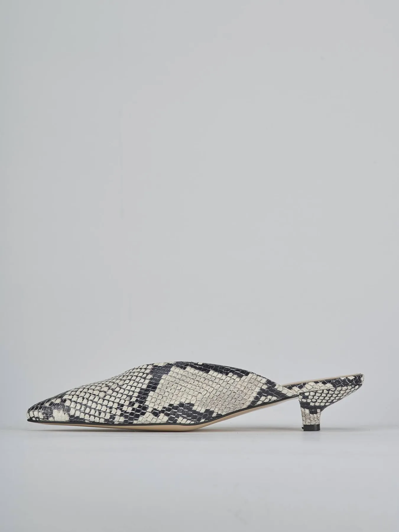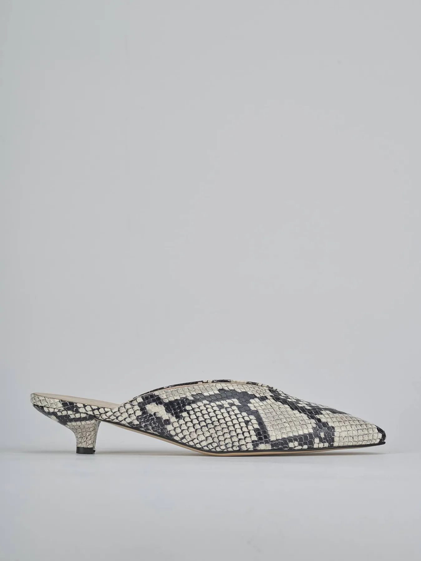 Sabot tacco 4 cm fondo in leggerissima gomma e soletto interno in vera pelle. Tomaia in morbida pelle stampata pitone, punta sfilata, scollo a ‘V’, liscio e comodo tacco rocchetto. Perfetto per qualsiasi occasione dalla più divertente a quella più solenne.