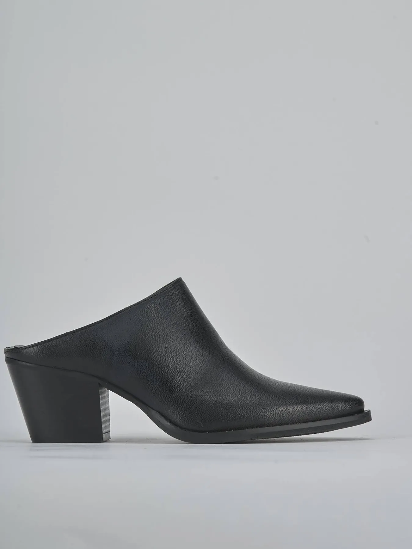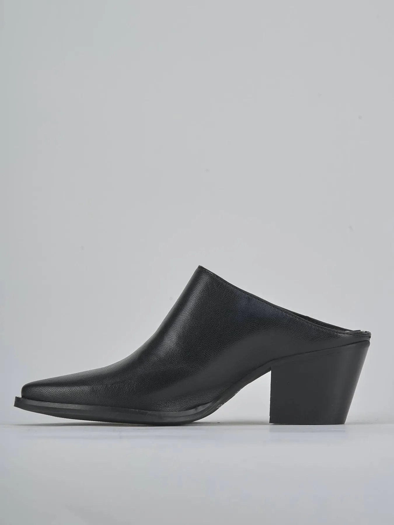 Sabot tacco 6 cm fondo in gomma e soletto interno in vera pelle. Tomaia in morbida pelle, punta sfilata, cuciture a mano e tacco grosso stabile. Guardolo sporgente con piccole borchie per un look chic.