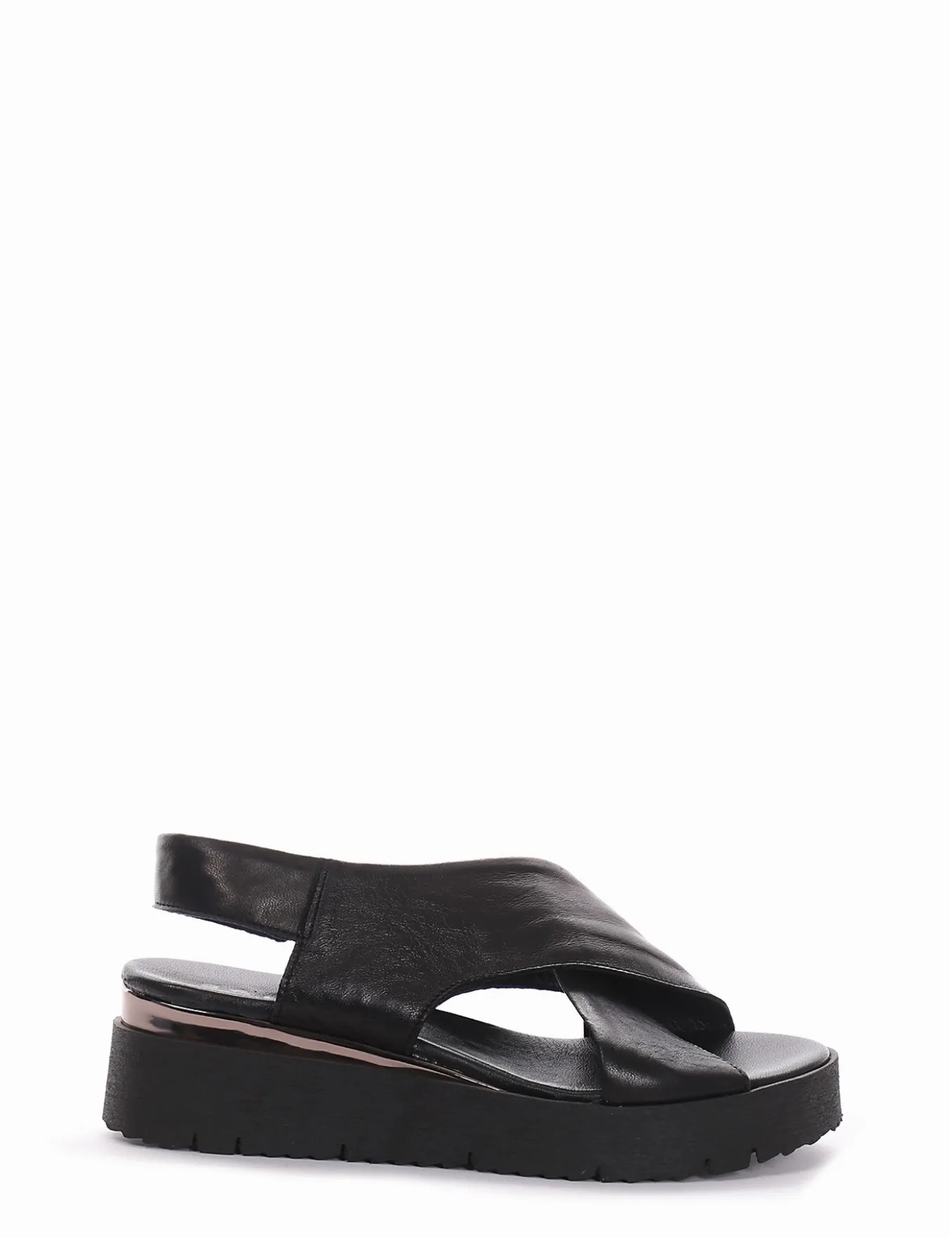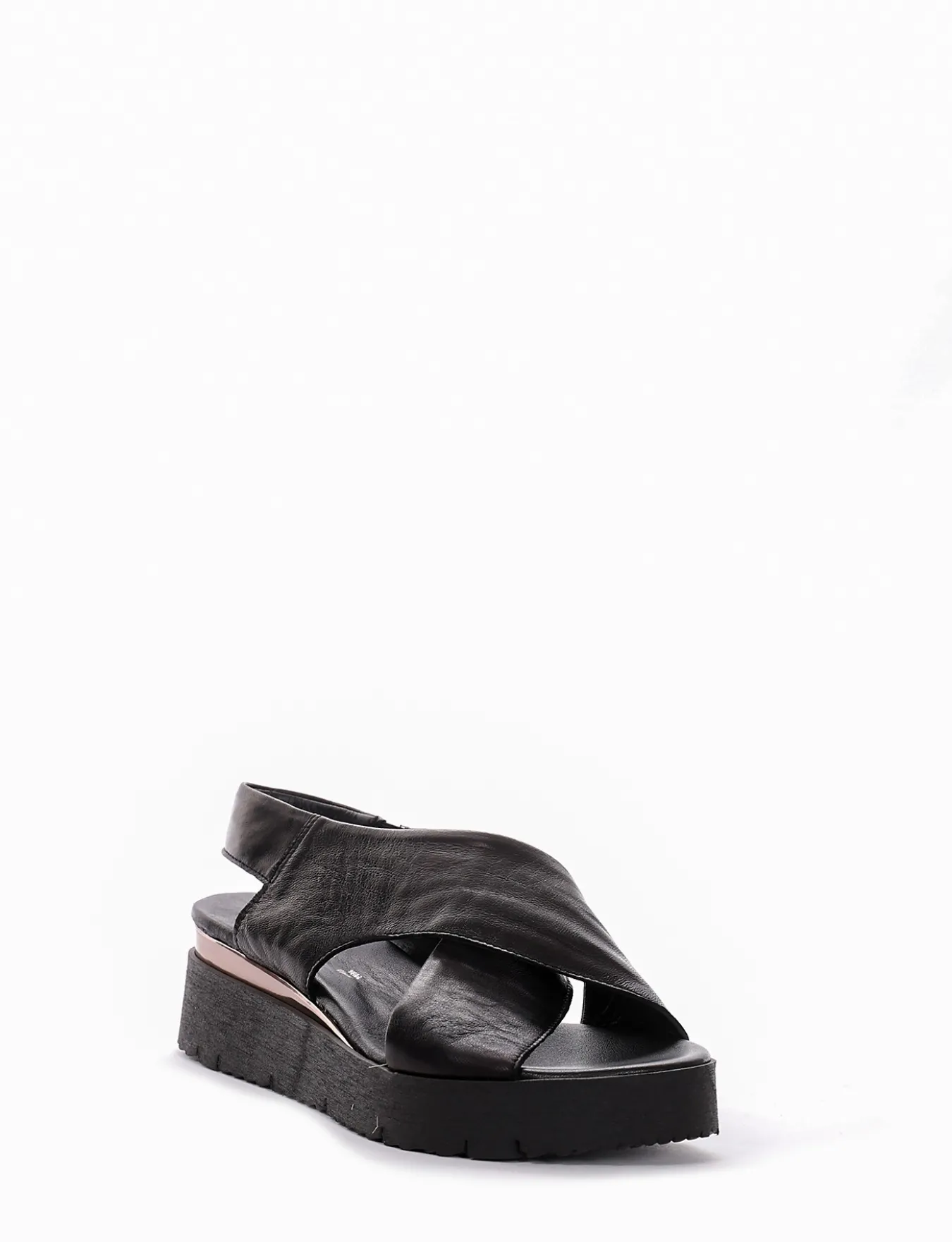 sandalo zeppa 3 cm, fondo in gomma e soletto interno in vera pelle. Tomaia in morbidissima pelle incrociata, aperto in punta e cinturino posteriore fisso regolabile con fascetta elastica.