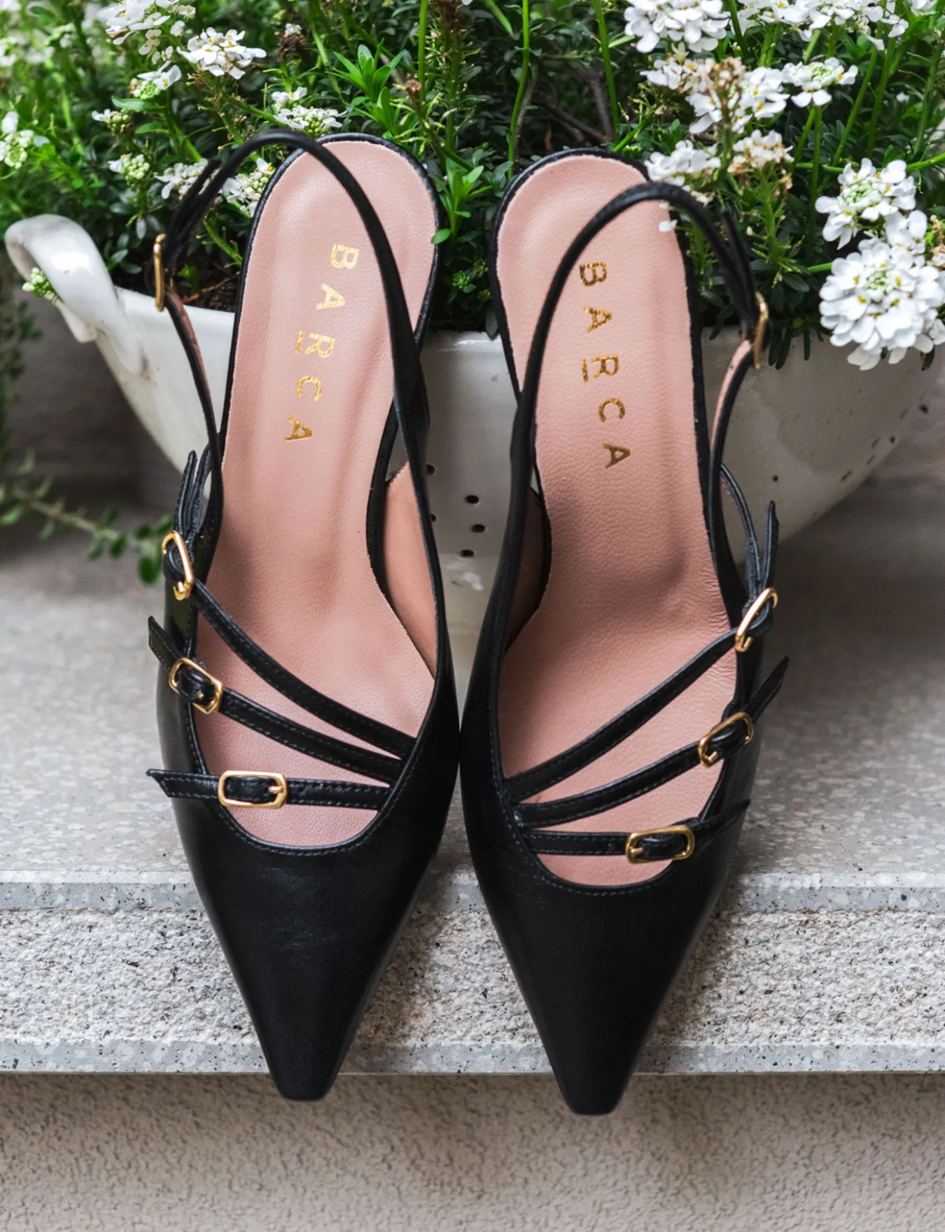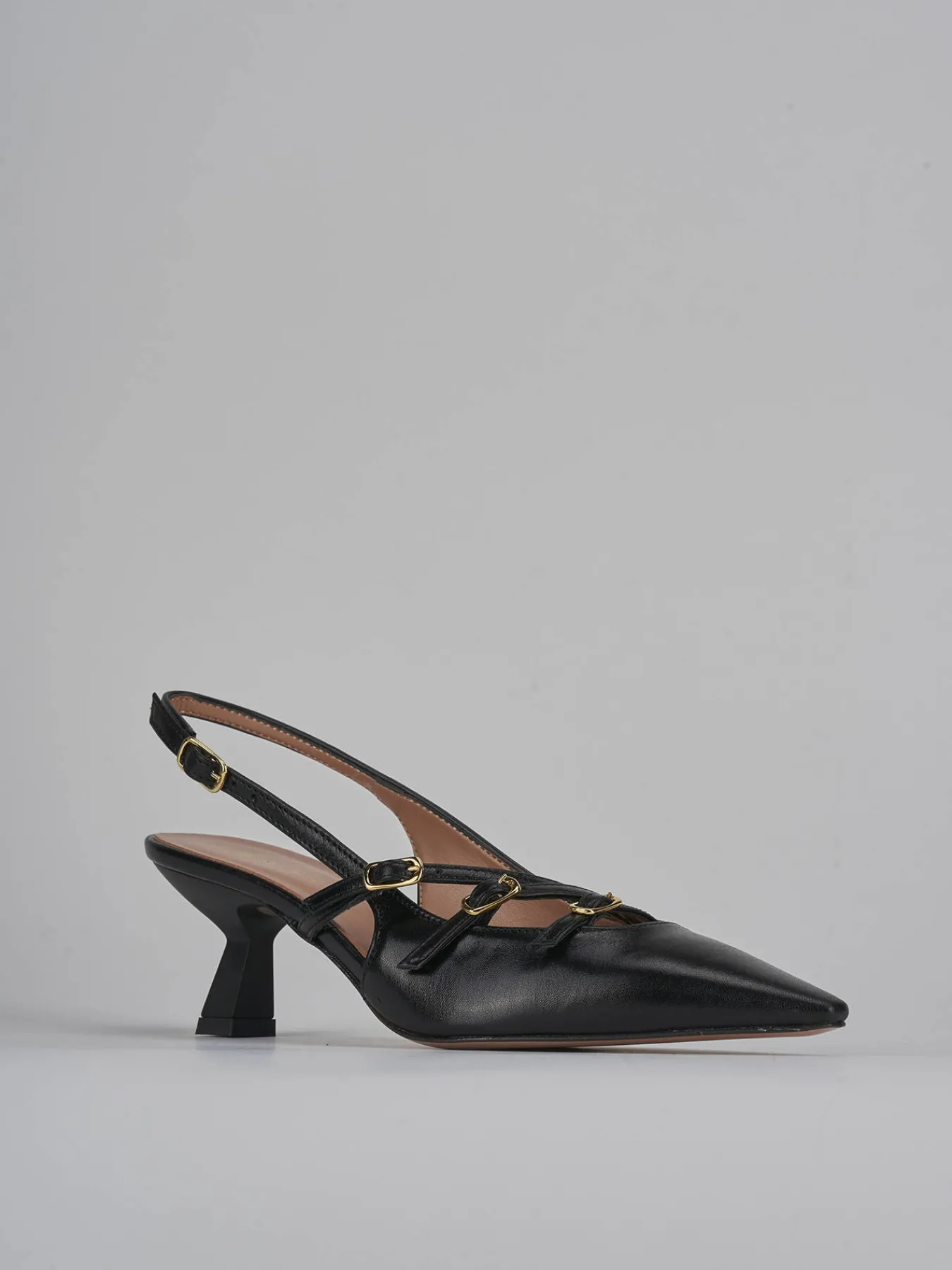 Slingback decolte’ tacco 5.5 cm fondo in cuoio e soletto interno in vera pelle. tomaia in morbida pelle, punta sfilata, scollo a ‘V’ , tre cinturini con fibbia regolabile sul collo del piede e uno sul tallone e nuovissimo tacco rocchetto. perfetto con una gonna o un tailleur.