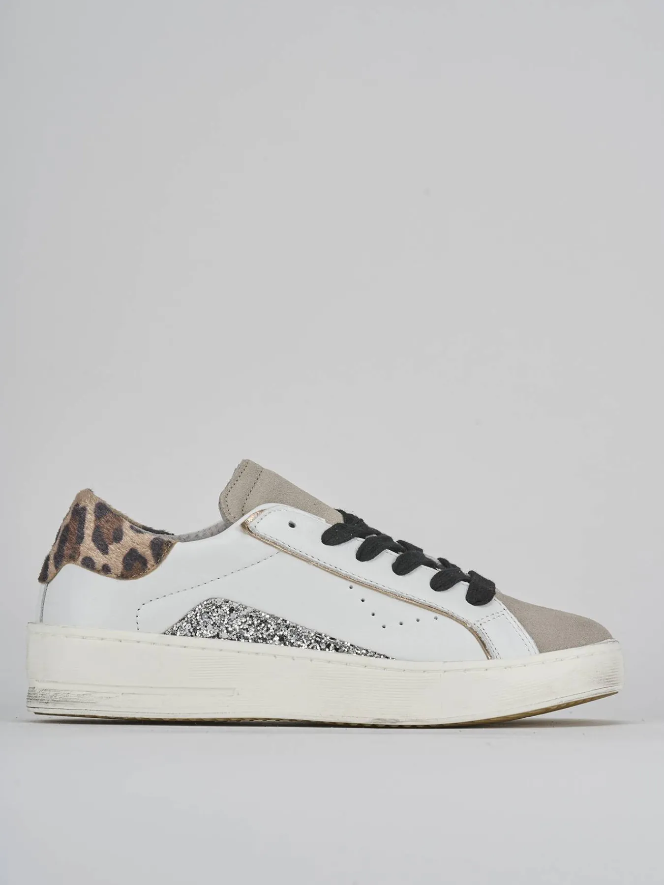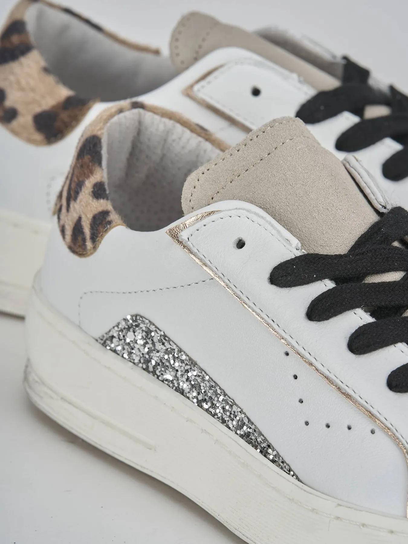La punta tonda e il riporto in camoscio sulla punta e sulla linguetta aggiungono un dettaglio raffinato, mentre il glitter argento laterale dona un tocco di brillantezza.