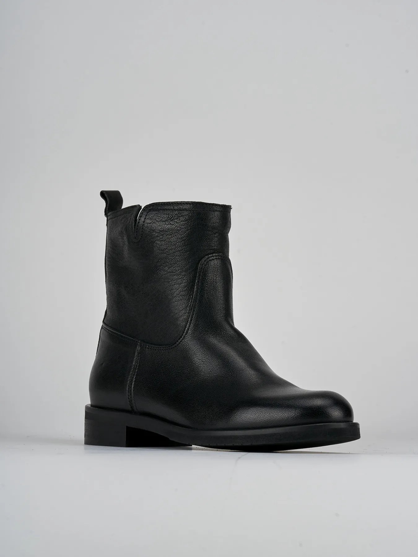 Stivaletto tacco 2 cm fondo in leggerissima gomma e soletto interno in vera pelle. Tomaia in morbida pelle, punta affusolata, cuciture a vista, piccolo scollo a ‘V’ sui lati e tacco solido. Modello passepartout per eccellenza, pensato per le attività di ogni giorno.