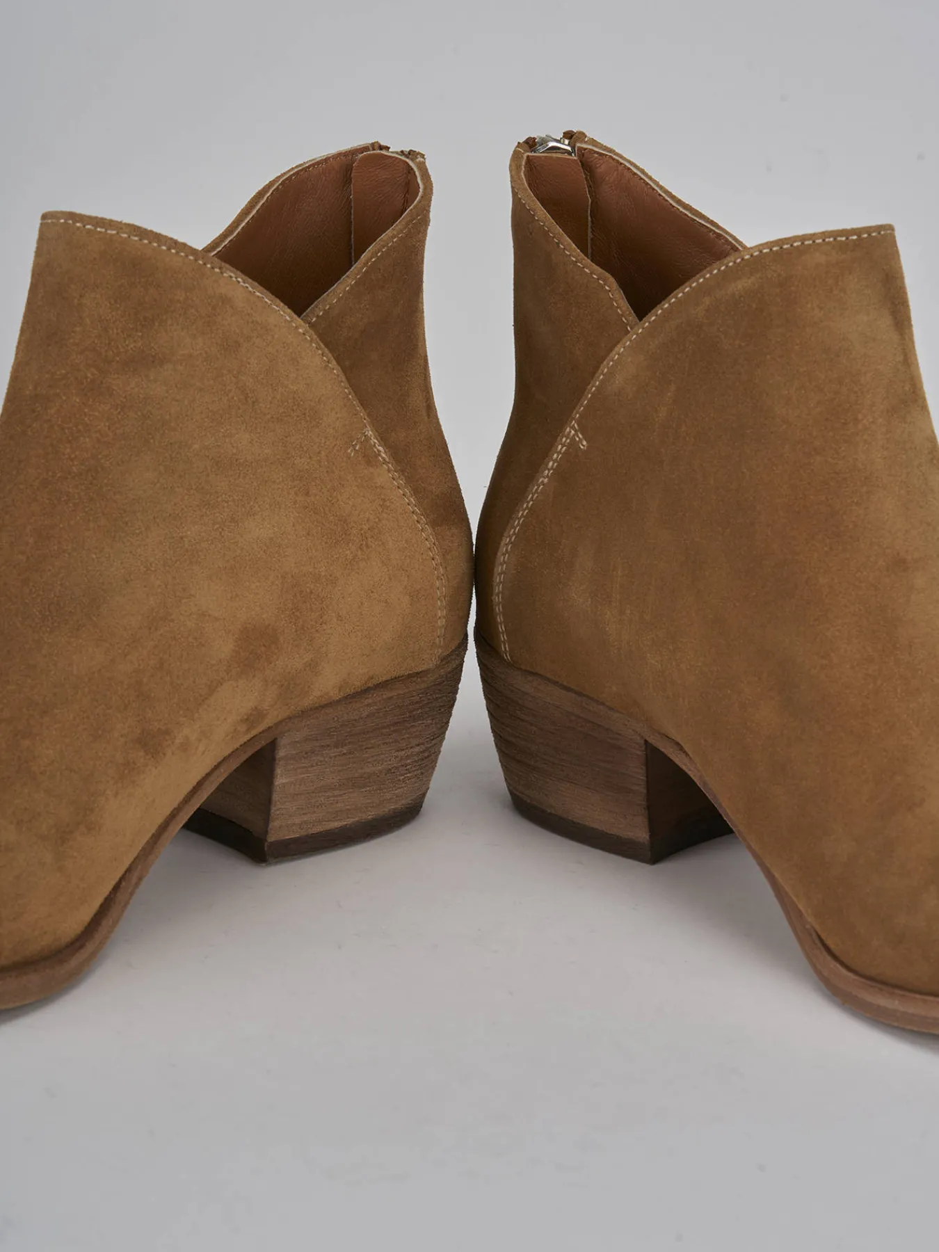 Stivaletto tacco 5 cm fondo in leggera gomma e soletto interno in vera pelle. Tomaia in morbido camoscio, punta leggermente sfilata, cuciture in rilievo, comoda cerniera posteriore, bordi laterale a ‘V’ e tacco cubano. Perfetto con un jeans o una gonna.