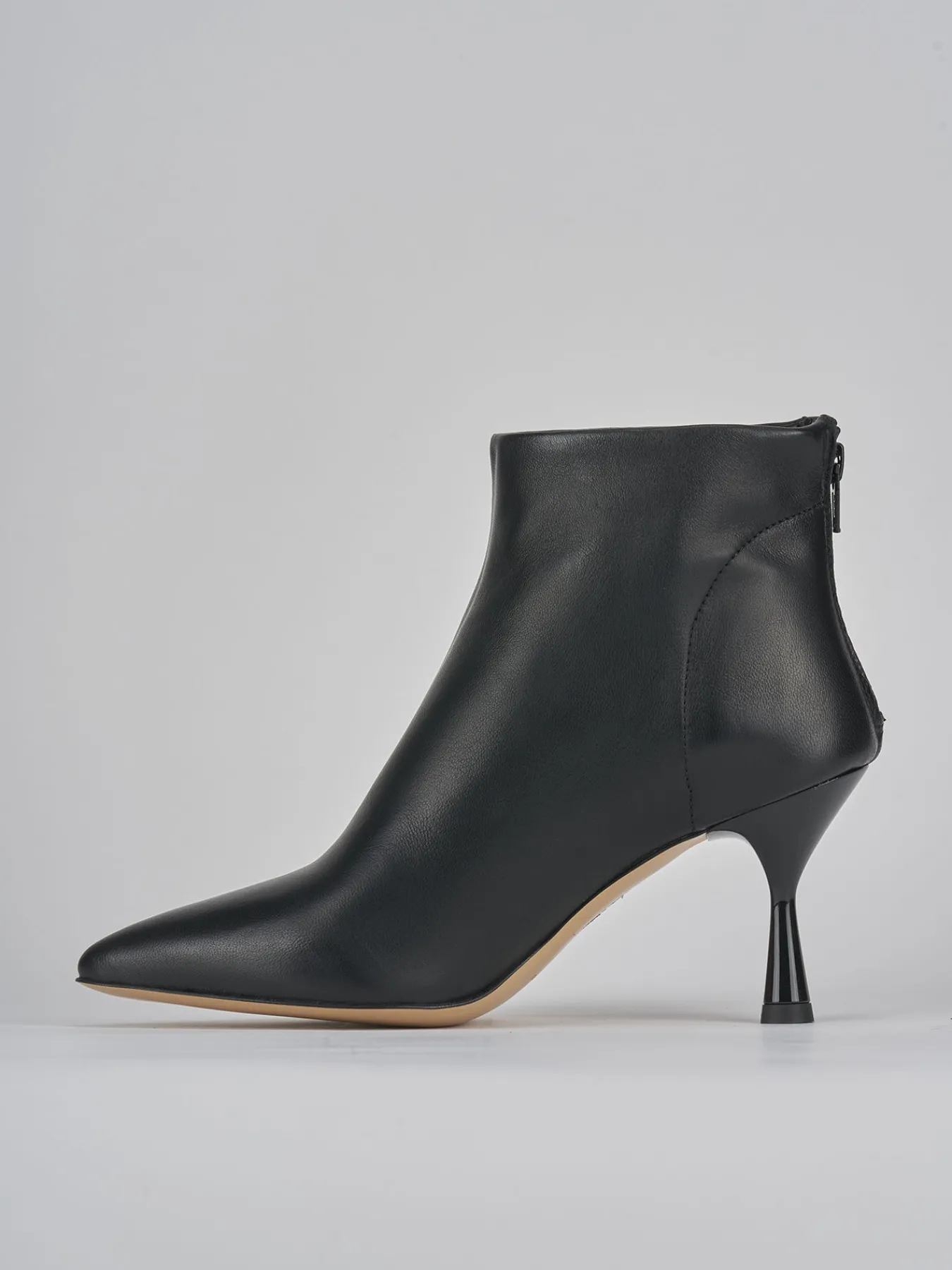 tronchetto tacco 7 cm fondo in gomma e soletto interno in vera pelle. tomaia in morbida pelle, punta sfilata, cuciture a vista sul tallone, fondo liscio, comoda cerniera posteriore e tacco rocchetto in materiale abs. versatile con ogni tuo look.