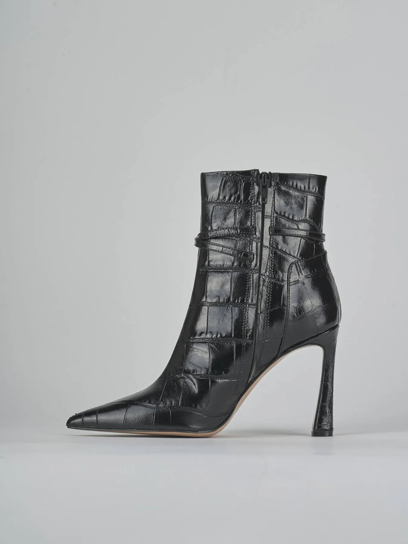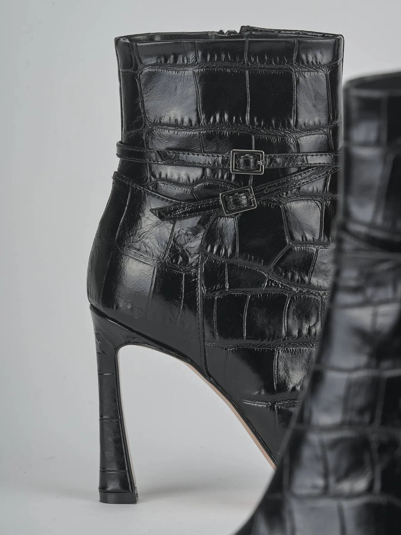 Due cinturini con fibbia regolabile incrociati sul gambale, che si ferma appena sopra la caviglia, offrono un look moderno e versatile.