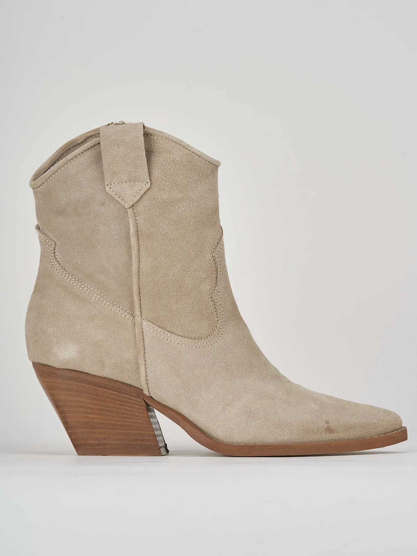 Stivaletto texano tacco 7cm, fondo cuoio e soletto interno in vera pelle. Tomaia in morbido camoscio, punta arrotondata, cuciture esterne visibili, tacco grosso per una camminata comoda, adatte con dei jeans per un look tex- cool.
