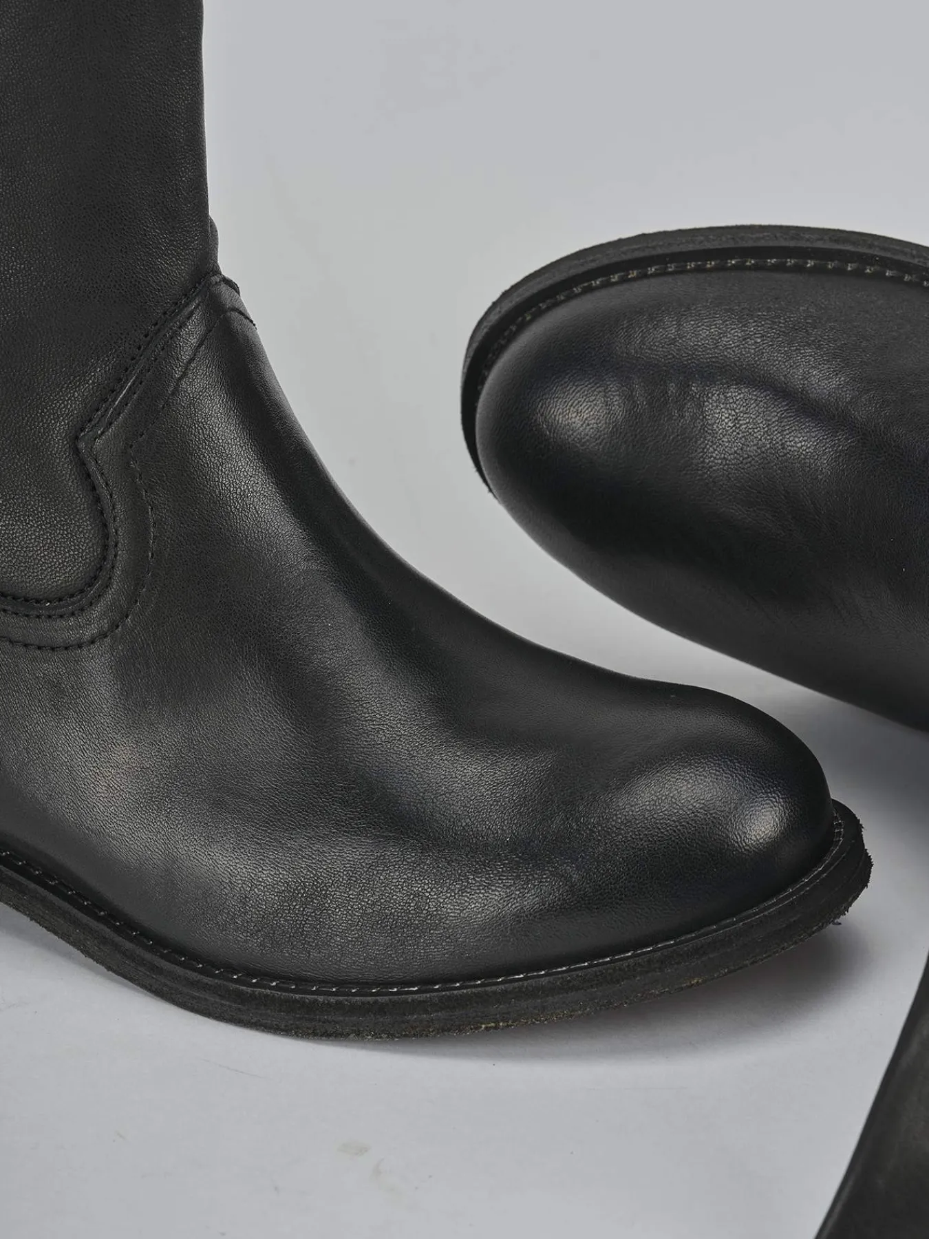 Le cuciture fatte a mano sul gambale, che si posiziona appena sotto il ginocchio, conferiscono un dettaglio artigianale unico.