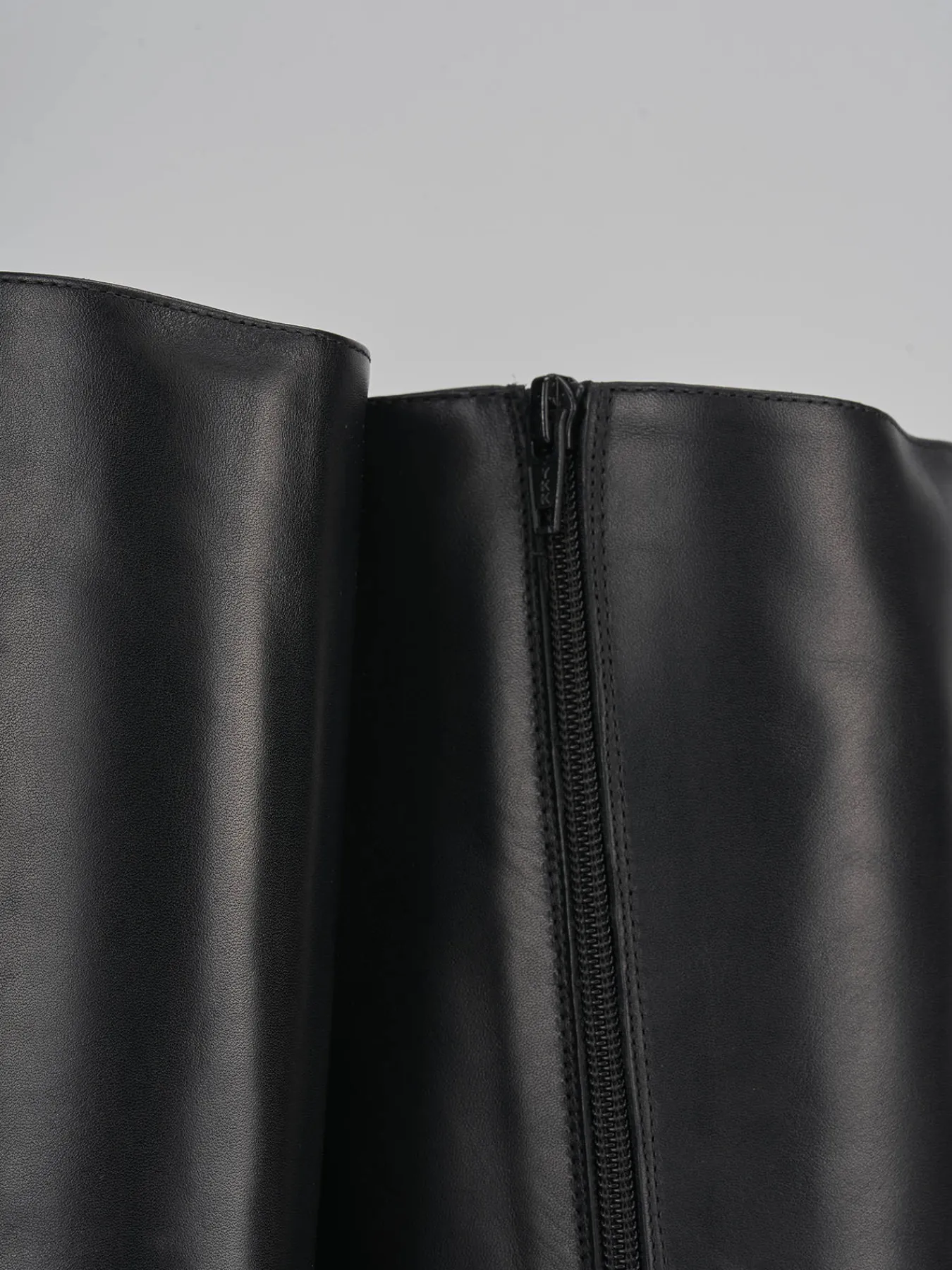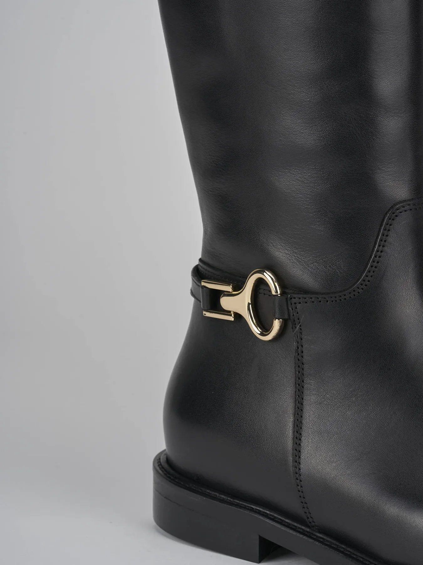 stivale tacco 2 cm fondo in gomma e soletto interno in vera pelle. tomaia in morbida pelle, punta affusolata, accessorio in metallo in caviglia e comoda cerniera laterale. gambale tubolare che misura appena sotto il ginocchio per un look chic.