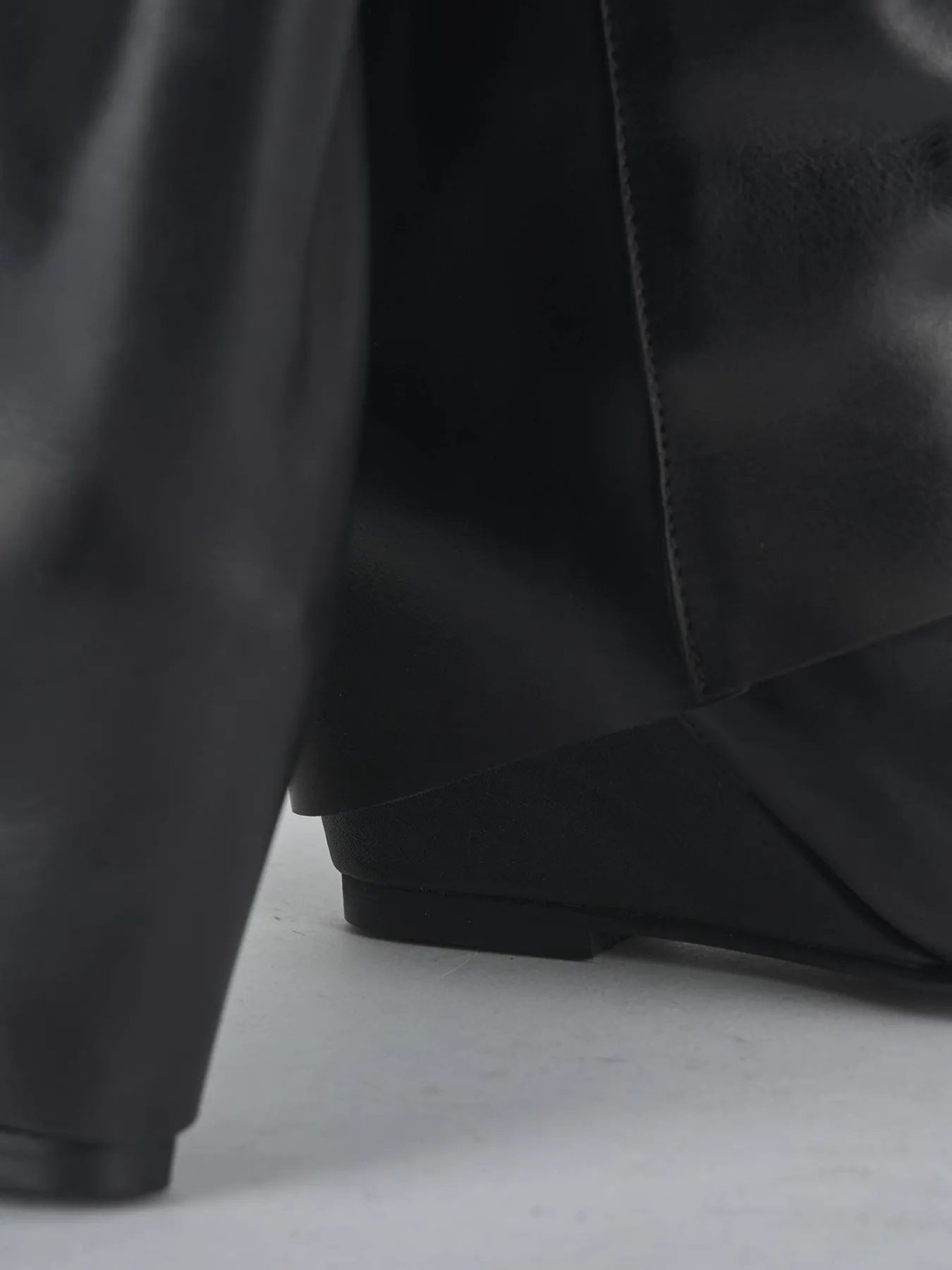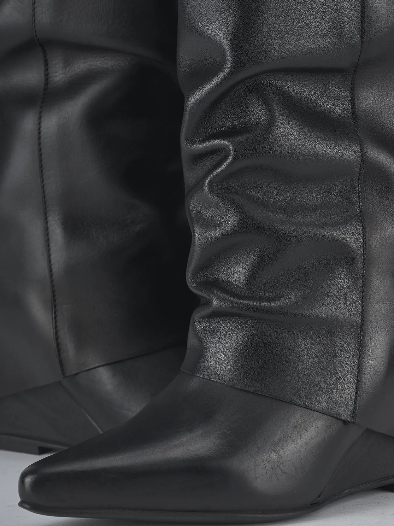 Stivale zeppa 4 cm fondo in gomma e soletto interno in vera pelle. Tomaia in morbida pelle, punta sfilata, cuciture a mano, risvolto aderente sul gambale che misura a 3/4 del polpaccio e gambale ampio. Perfetto per le occasioni più speciali.