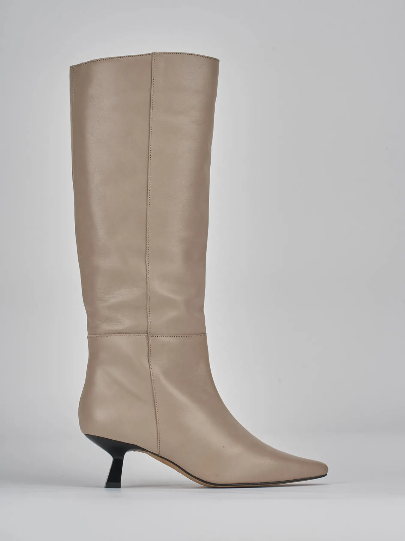 stivale tacco 5 cm fondo in gomma e soletto interno in vera pelle. tomaia in morbida pelle, punta sfilata, cuciture a mano a vista, altezza gambale appena sotto ginocchio e tacco rocchetto. perfetto per le tue occasioni più speciali.