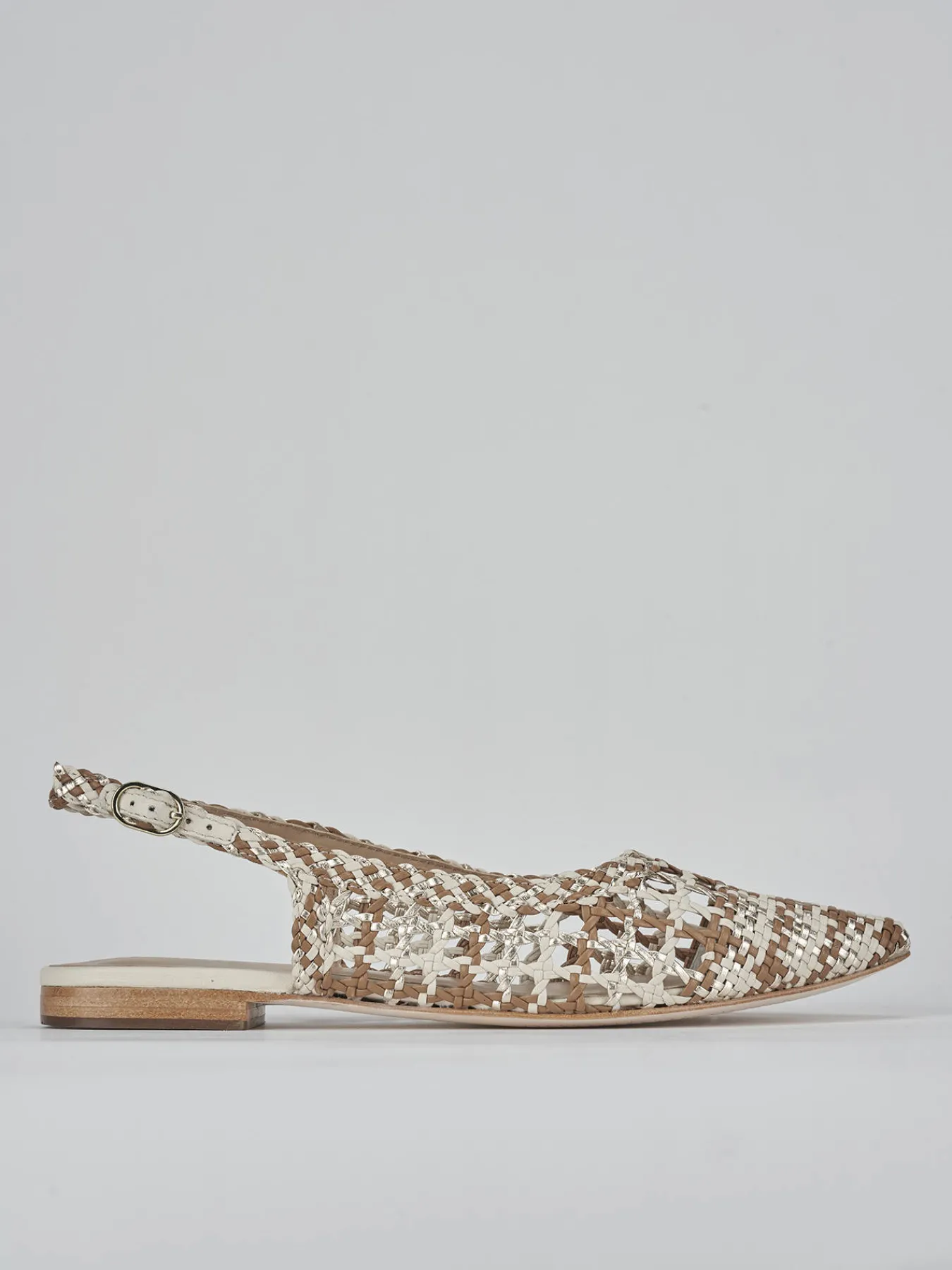 Realizzate in morbida pelle beige, queste scarpe esaltano un design finemente intrecciato tricolor che cattura l’attenzione.