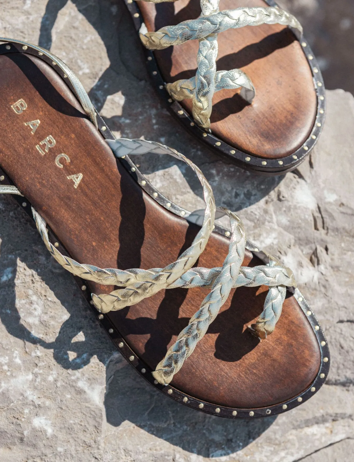 La tomaia in morbida pelle effetto laminato si distingue per le sue fasce a treccia e la punta affusolata, mentre l’infradito ad anello offre una calzata sicura e confortevole.