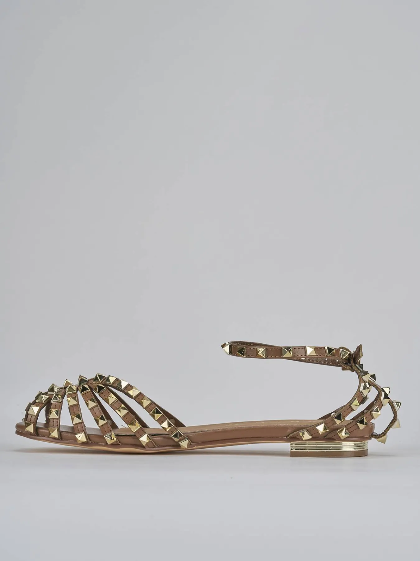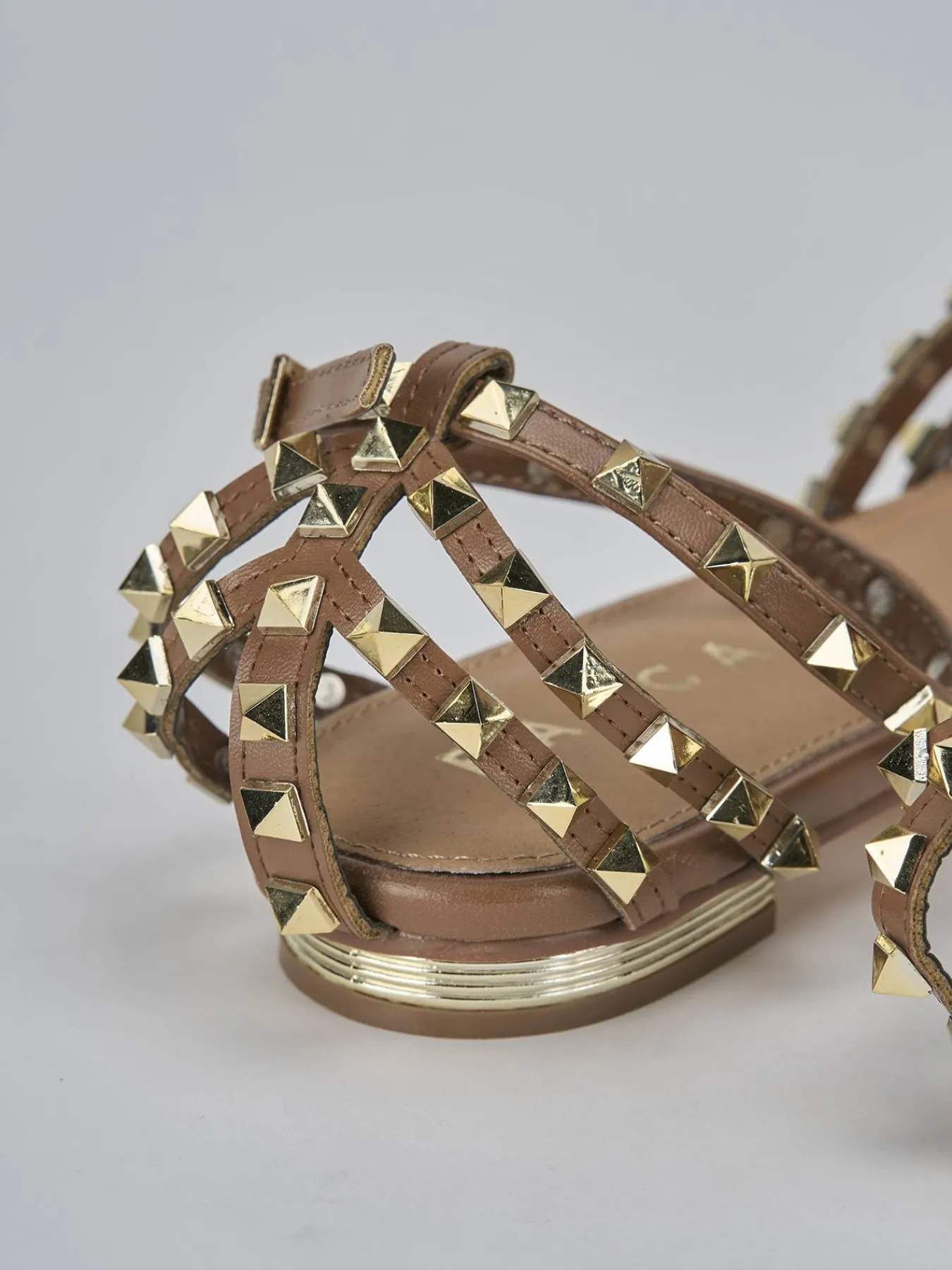 La tomaia in morbida pelle presenta una punta affusolata e fascette impreziosite da borchie dorate, che conferiscono un tocco di glamour.