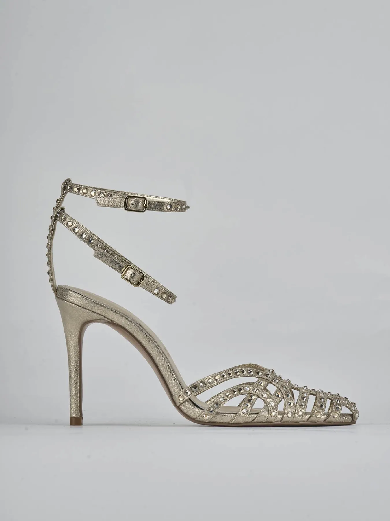 Sandalo tacco 8 cm fondo in leggera gomma e soletto interno in vera pelle. Tomaia in morbida pelle, punta sfilata, fascette sulla punta, strass, due cinturini in caviglia con fibbia regolabile e tacco fino. Perfetto per i tuoi look più cool.