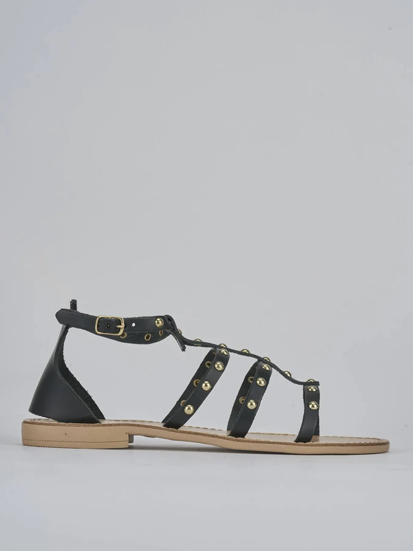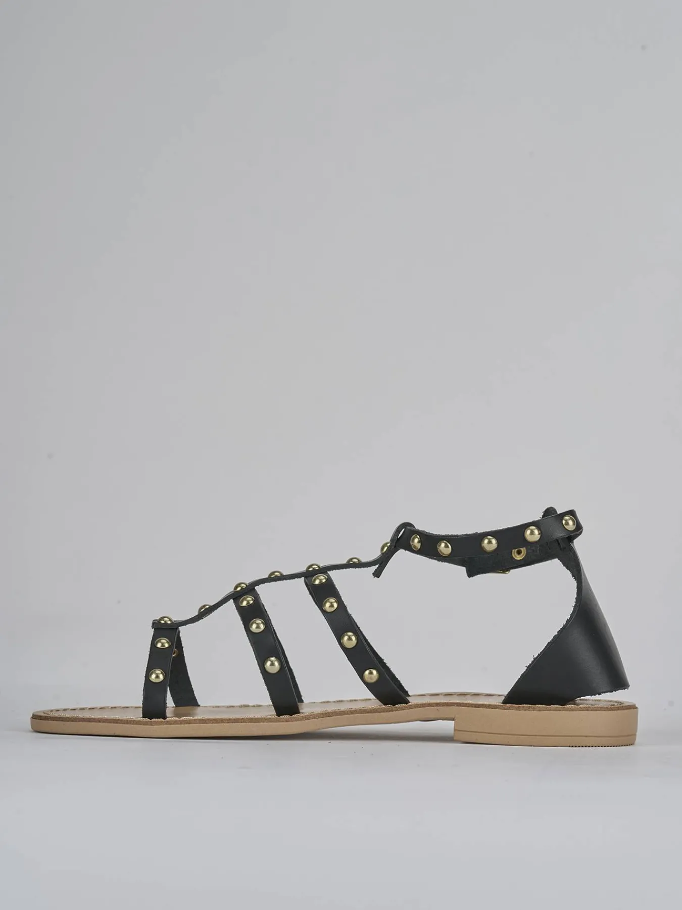 La tomaia in morbida pelle è arricchita da fascette adornate con piccole borchie, conferendo un tocco chic e raffinato.