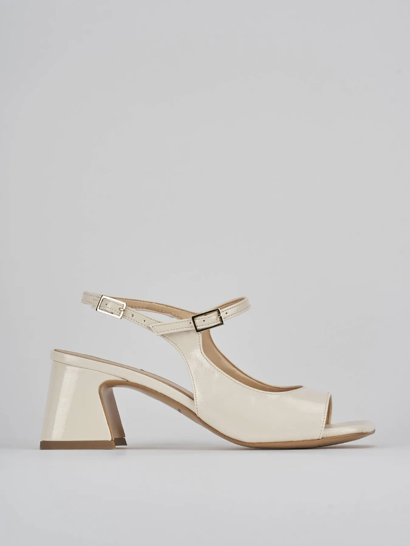 Sandalo tacco 6 cm, fondo in leggerissima gomma e soletto interno in vera pelle. Tomaia in morbida pelle effetto verniciato, punta squadrata con fascia unica in punta, due cinturini con fibie regolabili e tacco stabile grosso. Adatta sia con un paio di jeans che con una gonna.