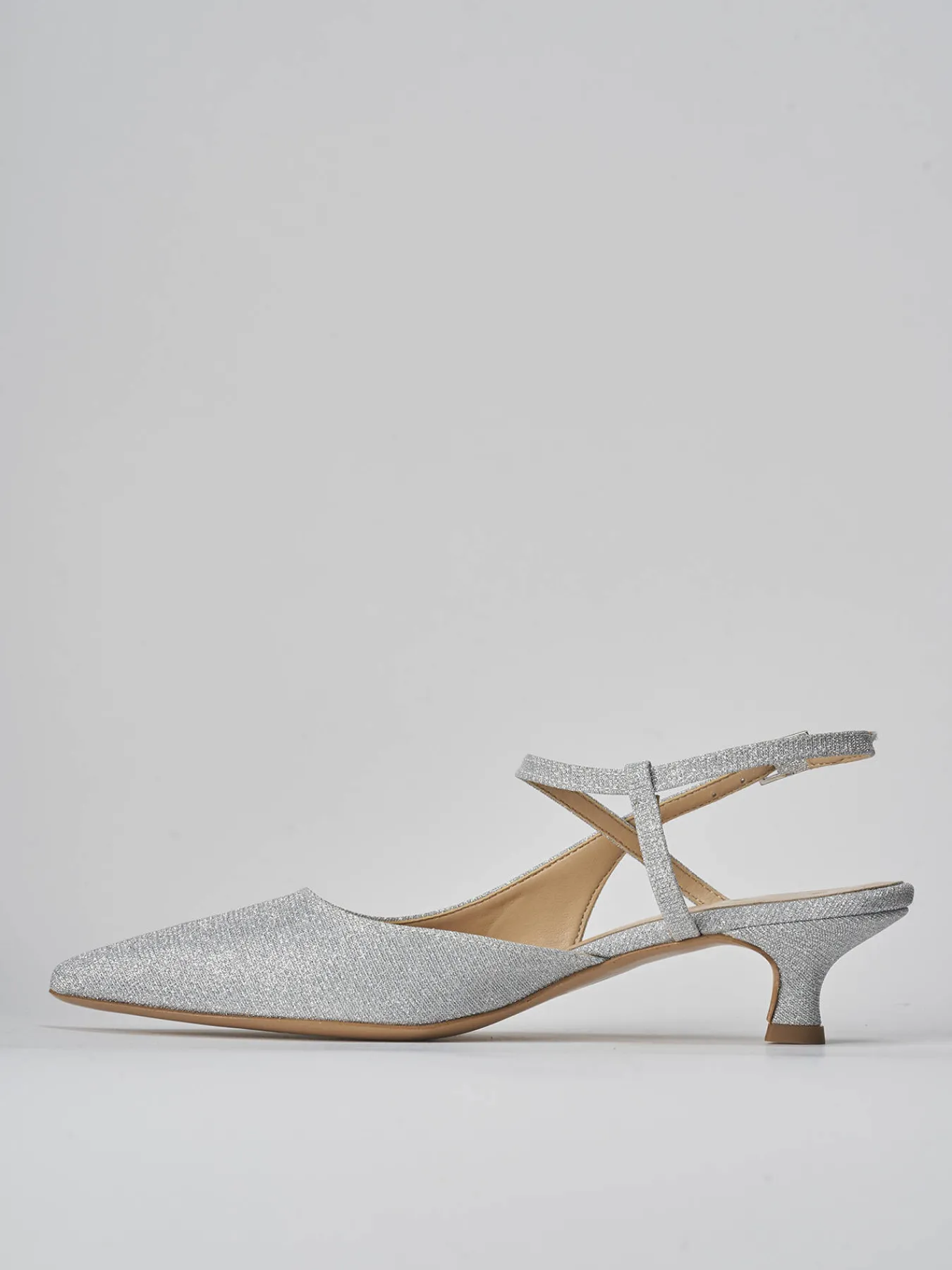 Slingback tacco 4 cm fondo in leggera gomma e soletto interno in vera pelle. tomaia in morbida pelle foderata in tessuto glitterato, punta sfilata, scollo squadrato, cinturino incrociato con fibbia regolabile e tacco rocchetto per un look cool.
