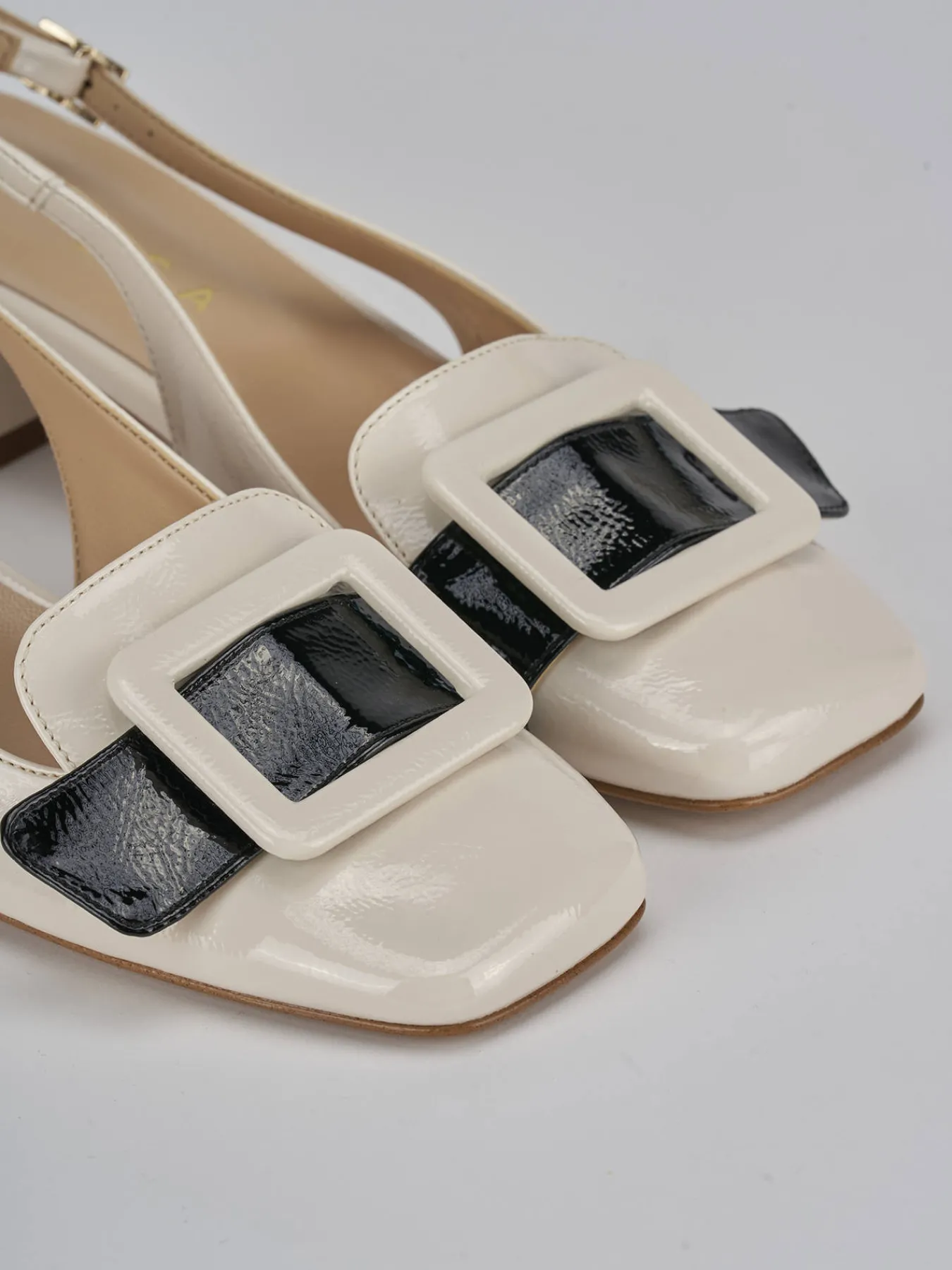 Slingback tacco 4 cm fondo in cuoio e soletto interno in vera pelle. tomaia in morbida pelle effetto verniciato, punta squadrata, accessorio, bicolor, cinturino con fibbia regolabile e tacco grosso per il massimo del comfort.