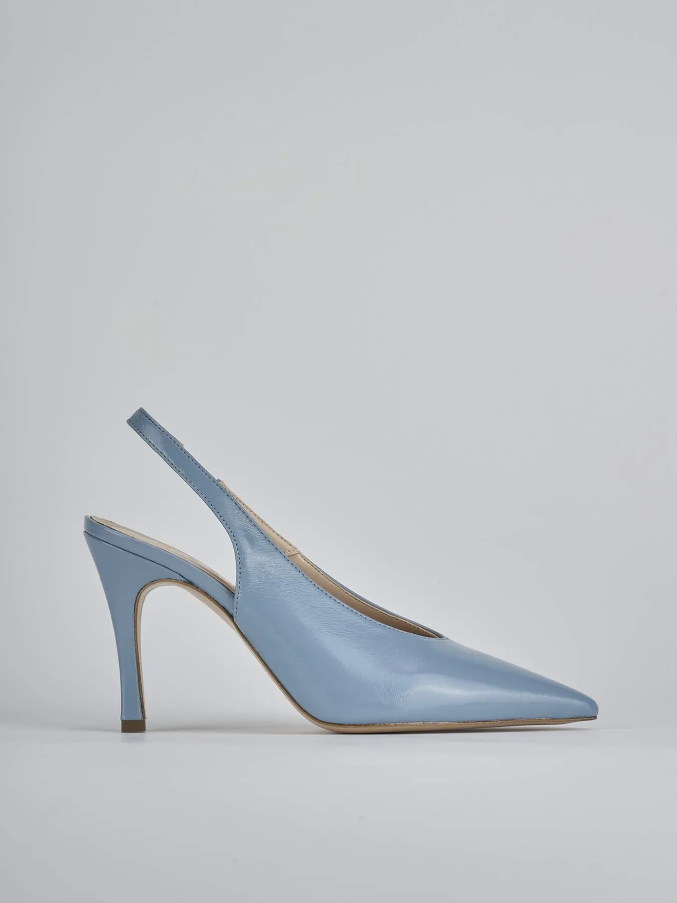 Slingback decolte’ tacco 9 cm fondo in cuoio e soletto interno in vera pelle. Tomaia in morbida pelle effetto verniciato, punta sfilata, scollo a ‘V’, liscio, cinturino elasticizzato e tacco fino per un look che non passa mai di moda.