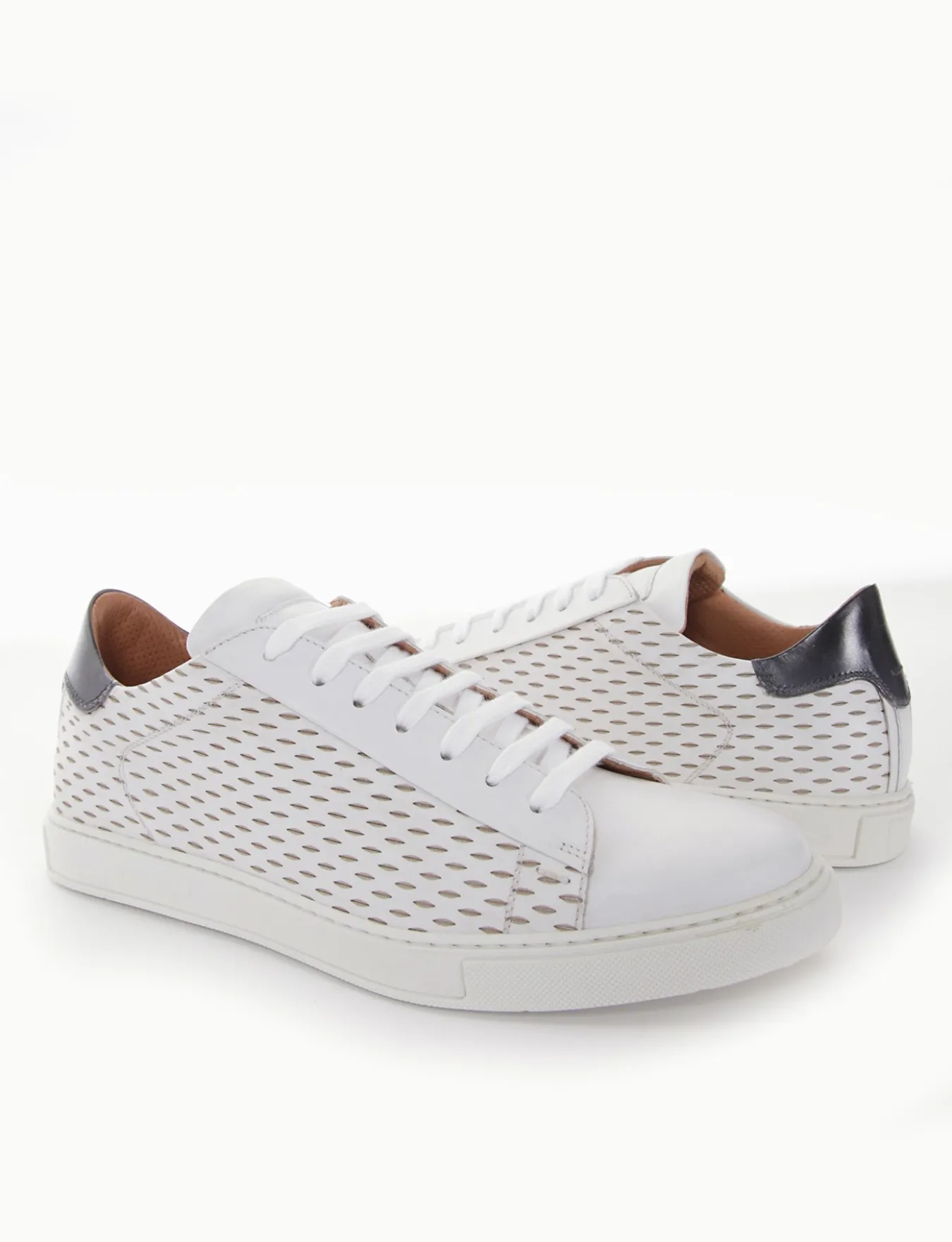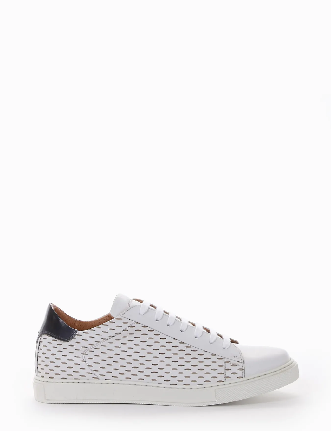 Sneakers fondo gomma e soletto interno in vera pelle. Tomaia in morbida pelle di vitello, laseratura nel parte laterale. Talloncino blu per un look sporty.