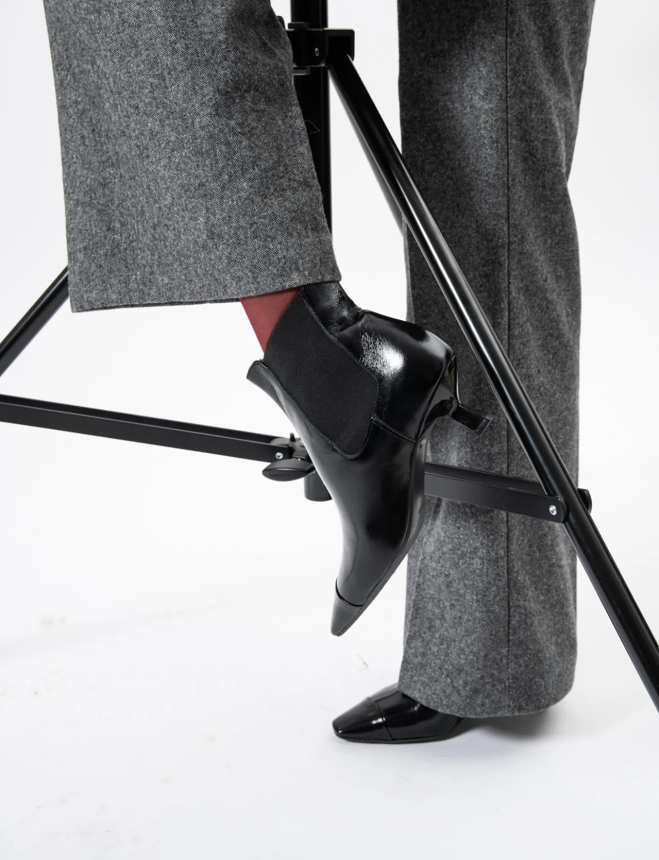 Il puntale ton sur ton e il nuovissimo tacco rocchetto completano un look sofisticato e alla moda.