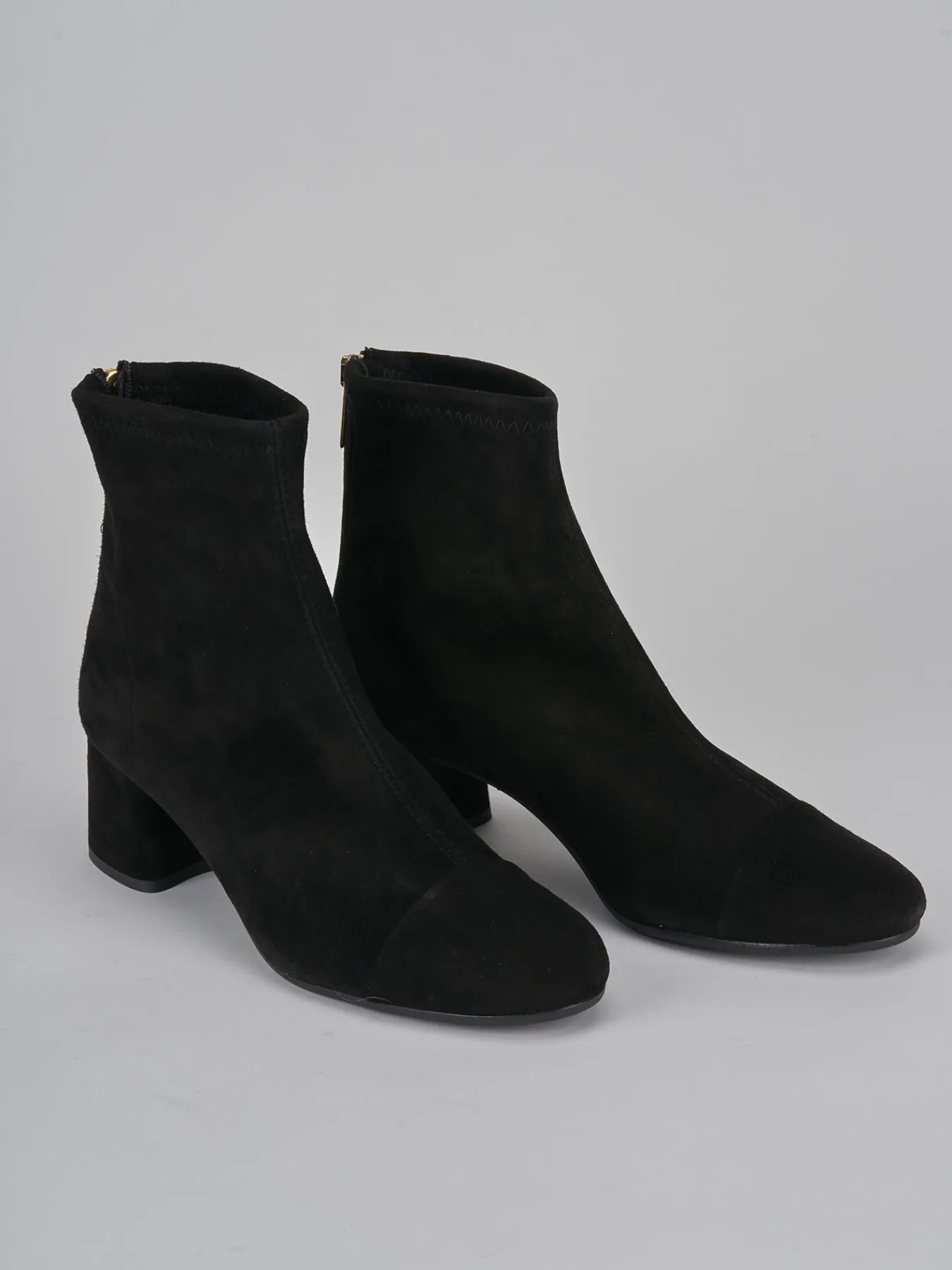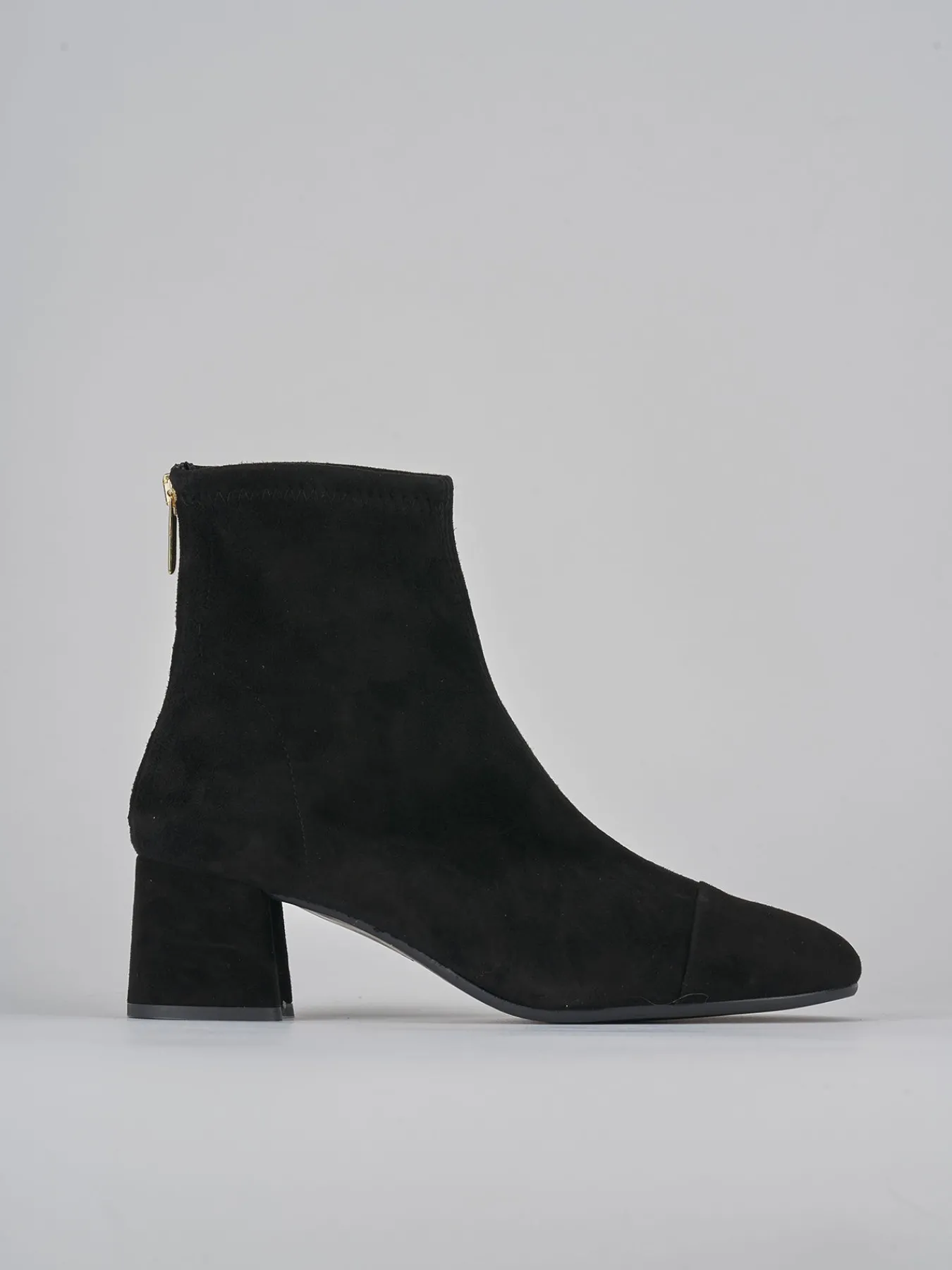 Stivaletto tacco 5.5 cm fondo in gomma e soletto interno in vera pelle. tomaia in morbido camoscio ed elasticizzato solo in caviglia, puntale ton sur ton, comoda cerniera posteriore e tacco grosso per un look che non passa mai di moda.
