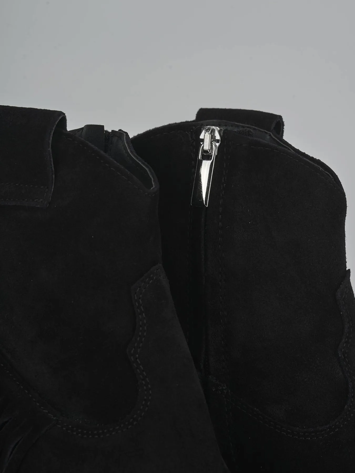 Realizzati in morbido camoscio, questi stivaletti presentano una punta sfilata e cuciture a mano in rilievo, esaltando l’artigianalità del design.