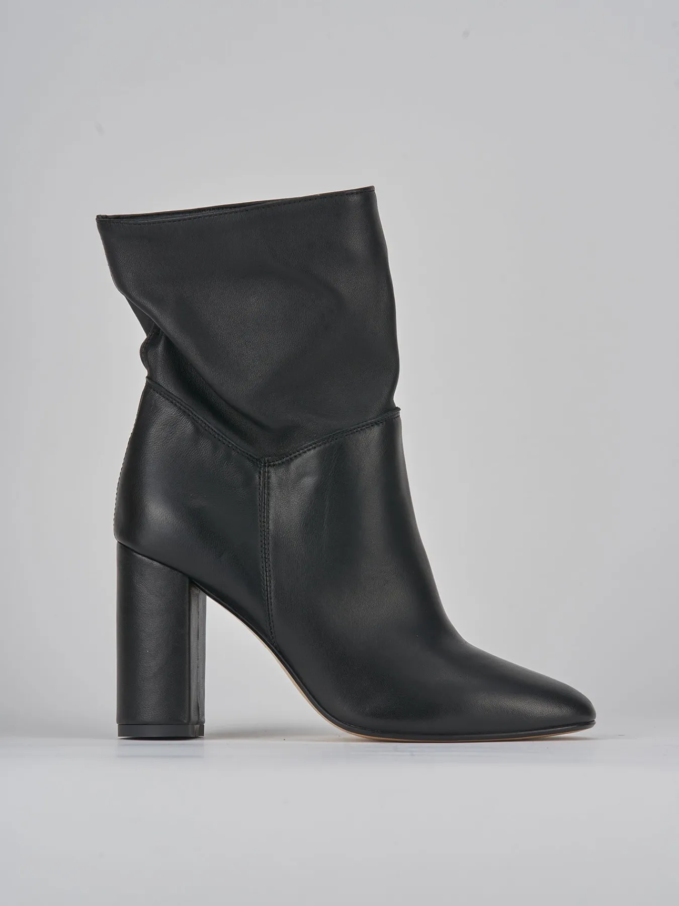 Stivaletto tacco 8 cm fondo in leggera gomma e soletto interno in vera pelle. tomaia in morbida pelle nappata, punta tonda, altezza gambale metà caviglia, cuciture a vista e tacco grosso. versatile e dal design classico che non passa mai di moda.