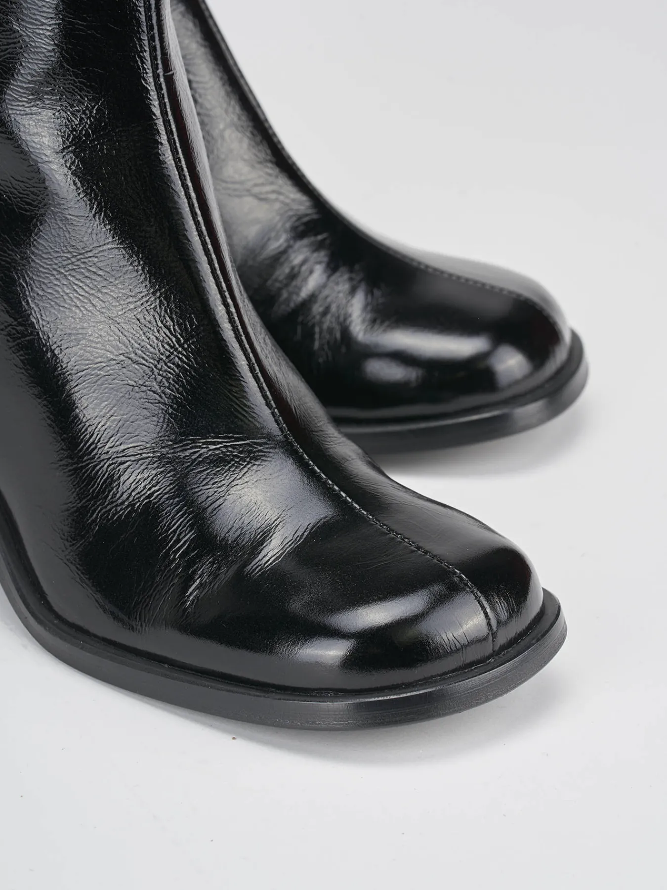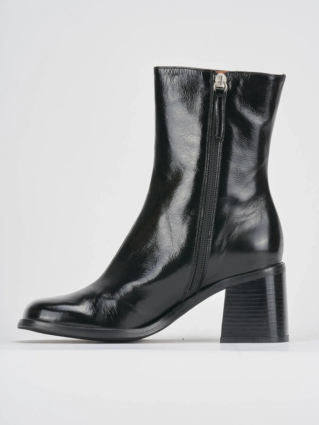 tronchetto tacco 8 cm fondo in leggerissima gomma e soletto interno in vera pelle. tomaia in morbida pelle effetto verniciato, punta squadrata, cuciture a vista, pratica cerniera laterale e tacco in legno per un look cool.