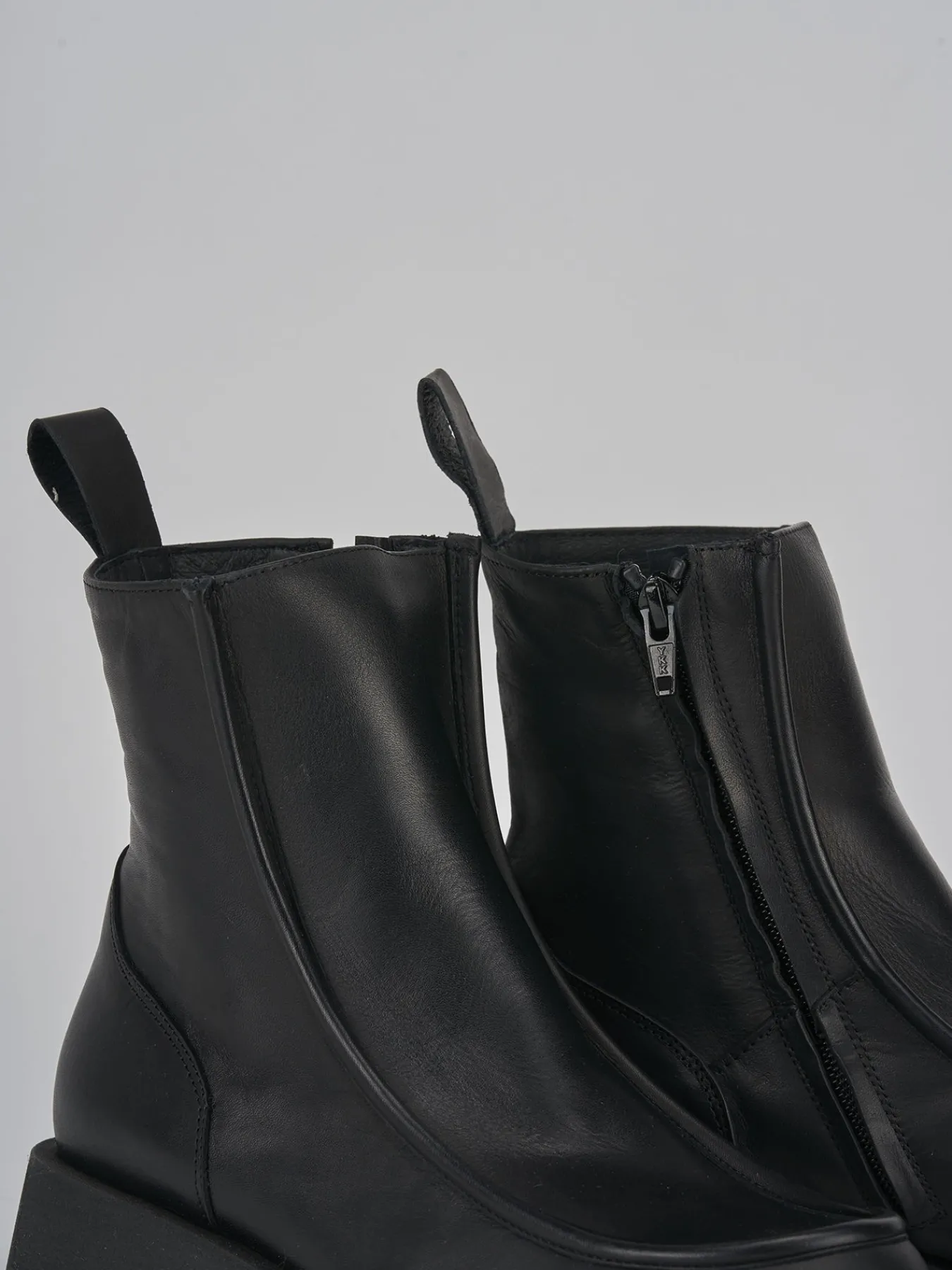 Stivaletto tacco 3 cm, fondo in gomma e soletto interno in vera pelle. Tomaia in morbido vitello, punta squadrata, cuciture visibili in rilievo, cerniera laterale e fondo seghettato per un look sporty-chic.