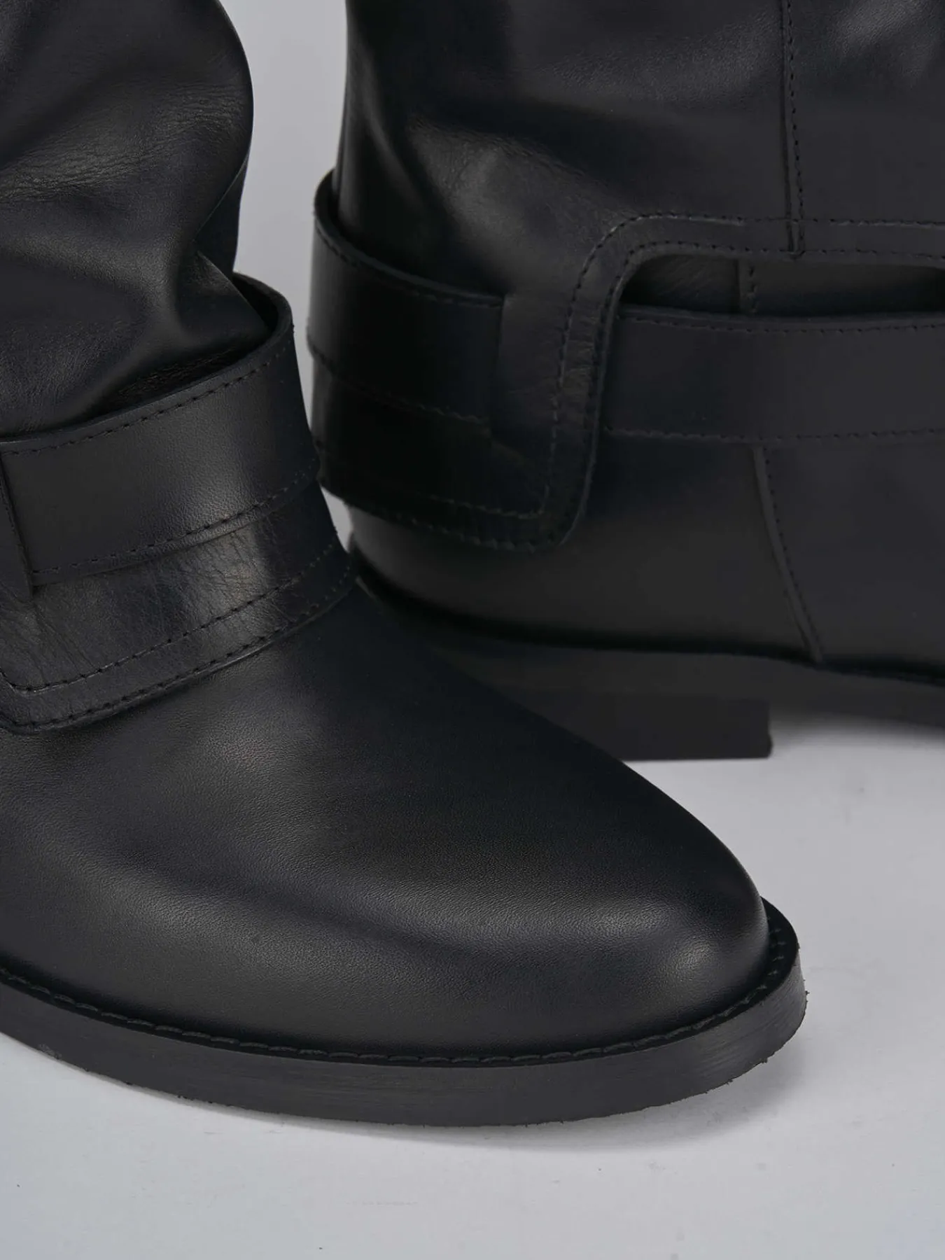 stivale tacco 2 cm fondo in gomma e soletto interno in vera pelle. tomaia in morbida pelle, punta tonda, accessorio in metallo in caviglia, risvolto lungo tutto il gambale che è tubolare e misura appena sotto il ginocchio. zeppa interna di 3 cm. la sua versatilità ti stupirà.
