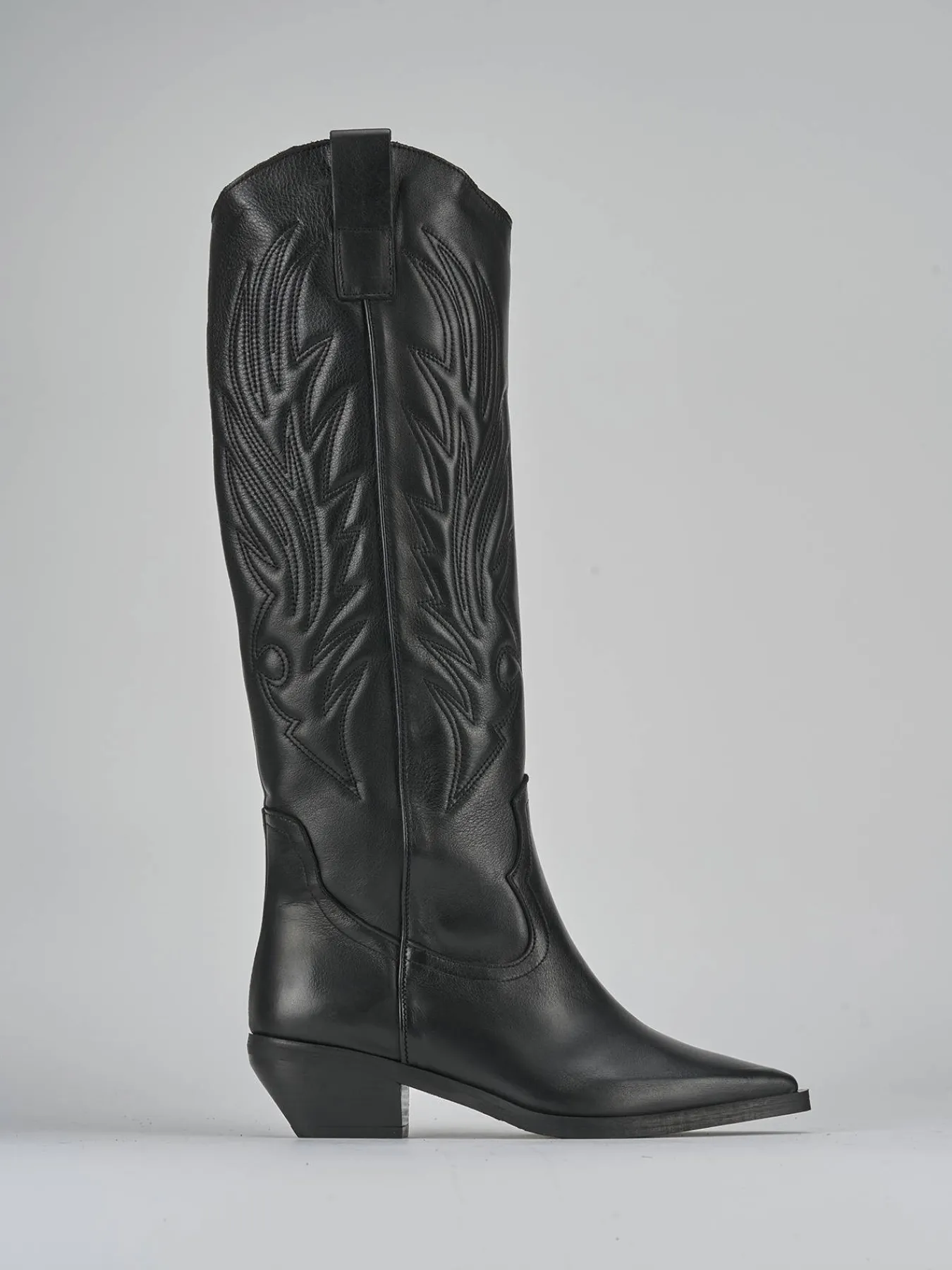 Le cuciture e i ricami sul gambale, che arriva appena sotto il ginocchio, donano un look distintivo e raffinato.