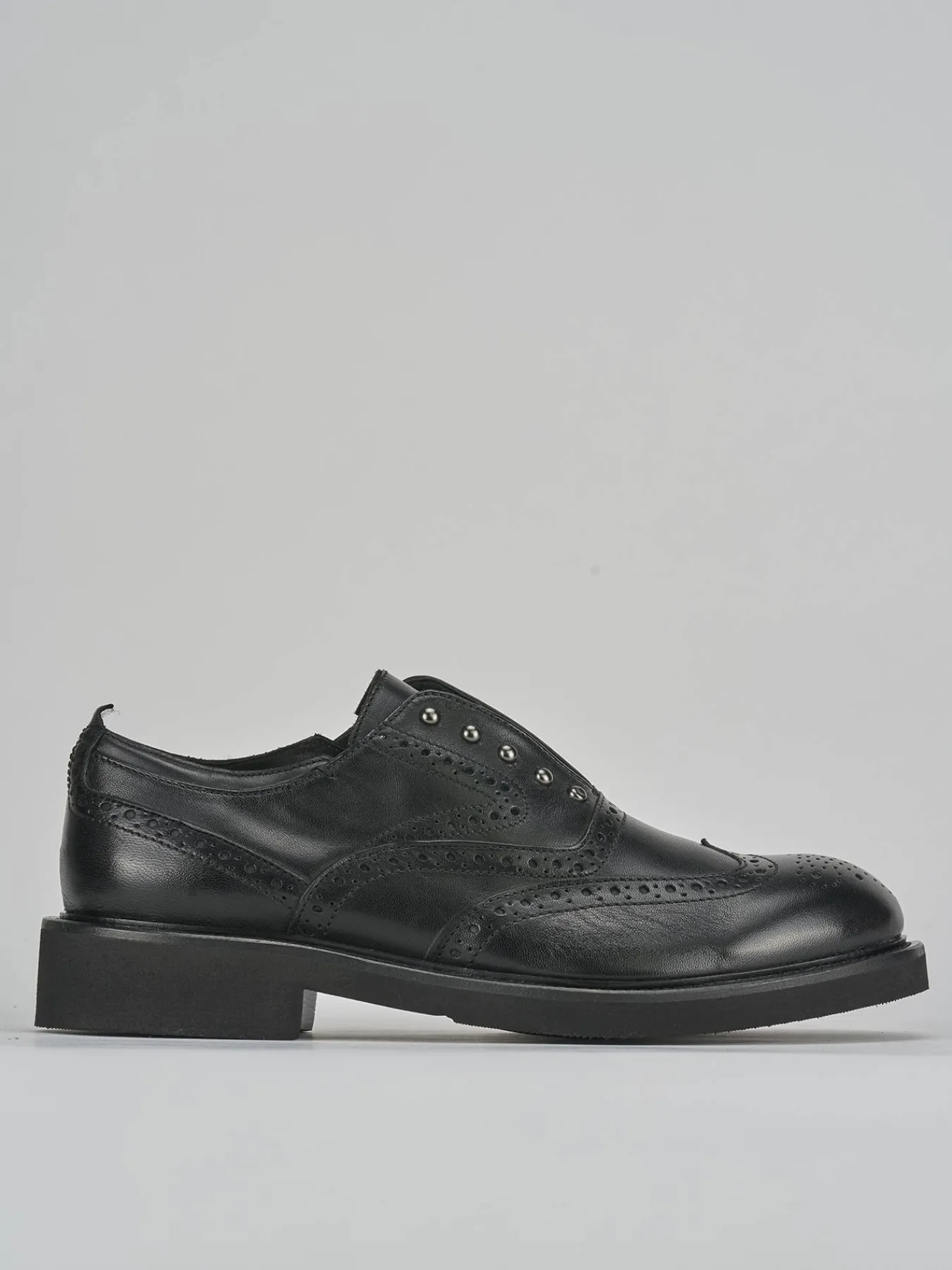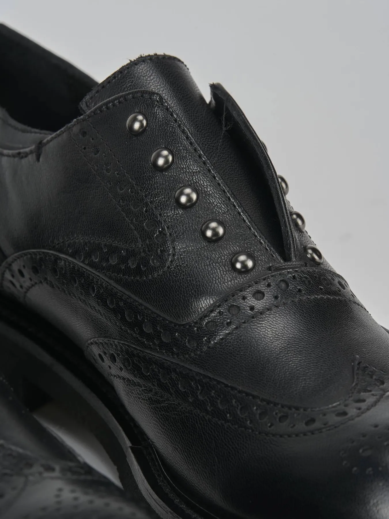 La tomaia è realizzata in morbida pelle, impreziosita da una pregiata lavorazione inglese e dettagli di borchie che aggiungono un tocco di originalità.
