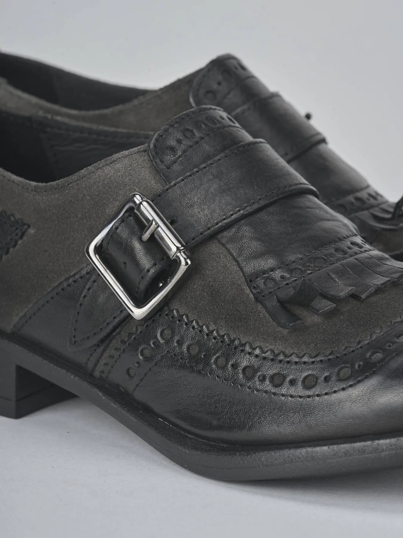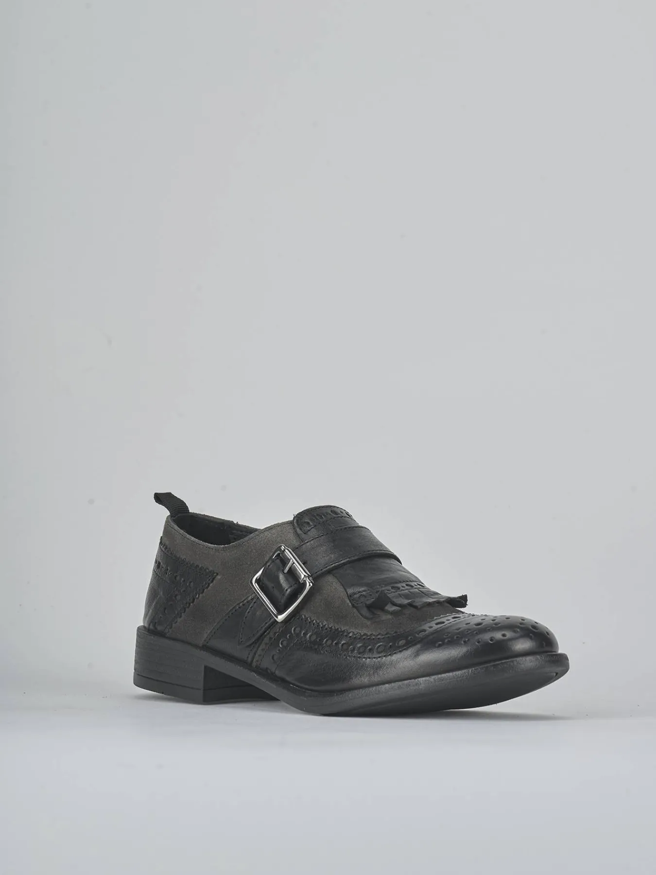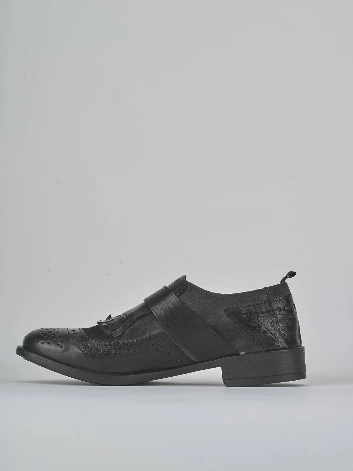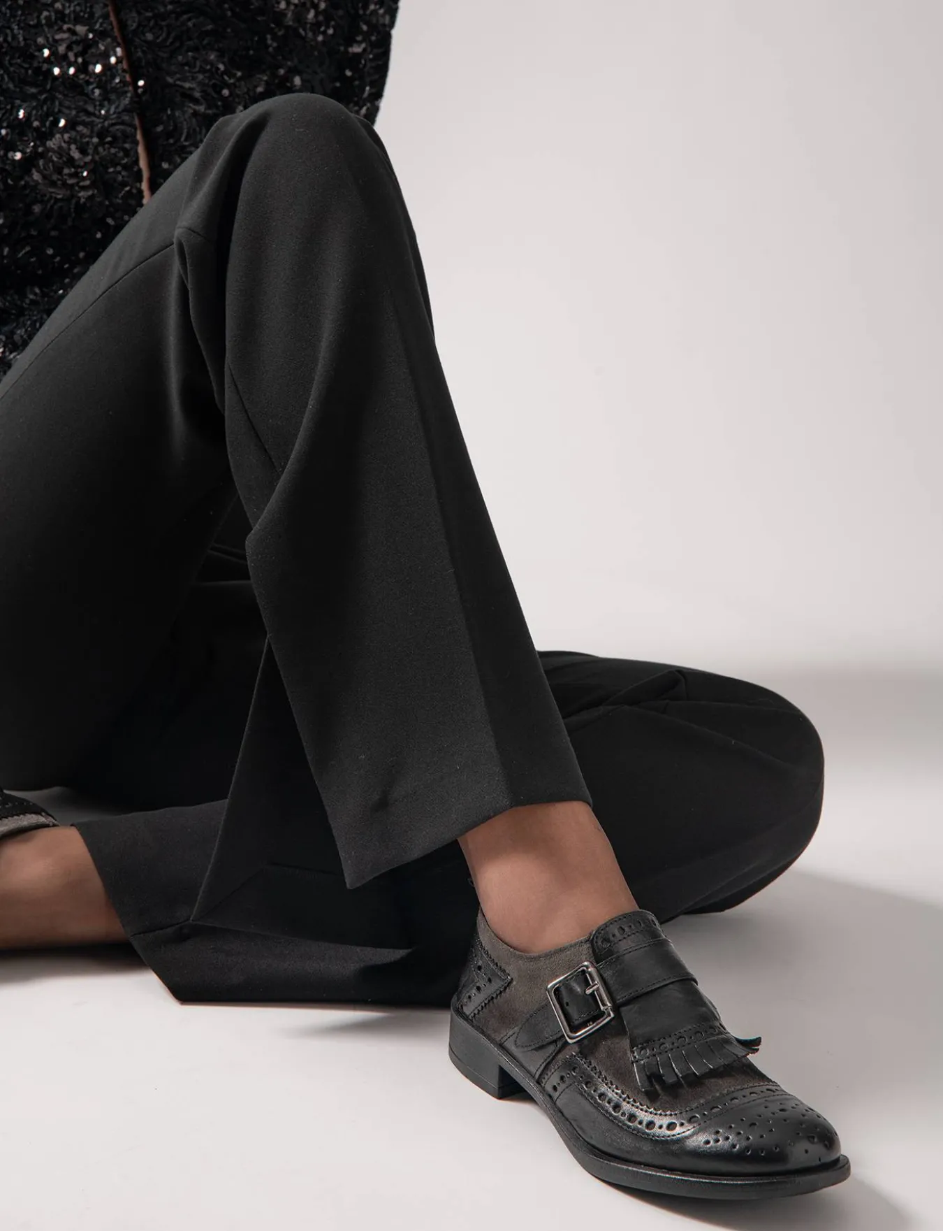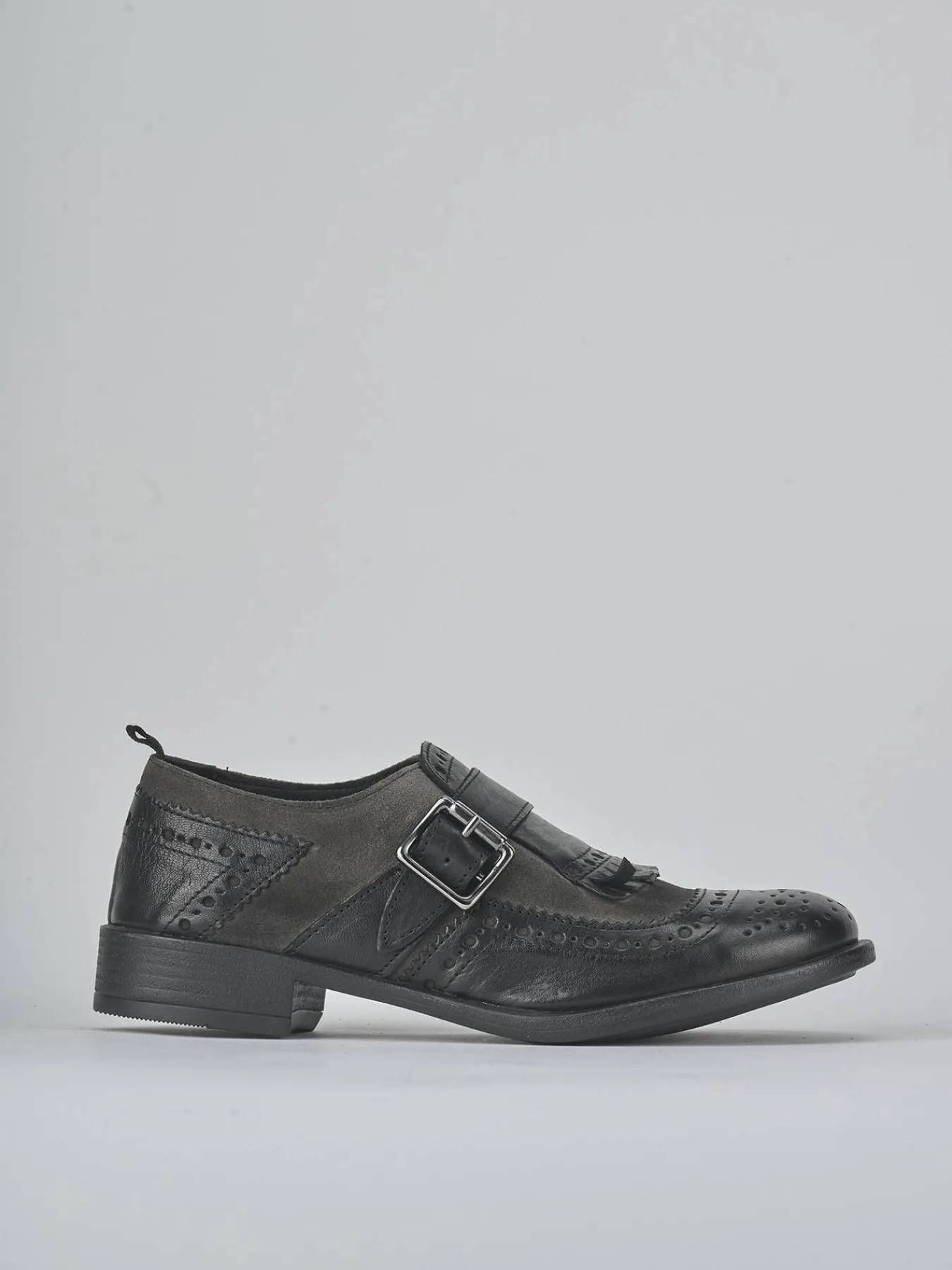 La tomaia è realizzata in morbida pelle, arricchita da un inserto in camoscio con frange che conferisce un tocco distintivo.