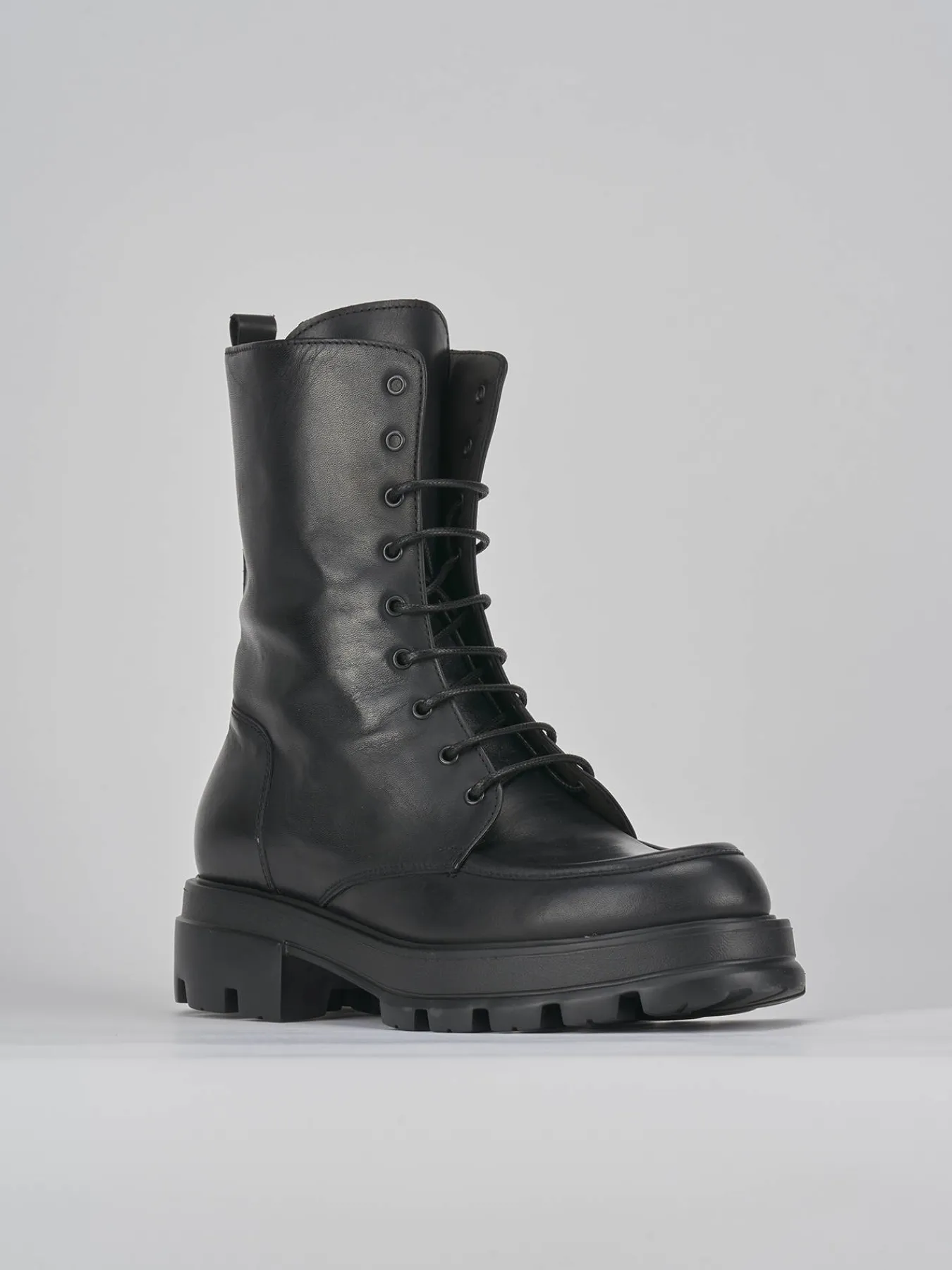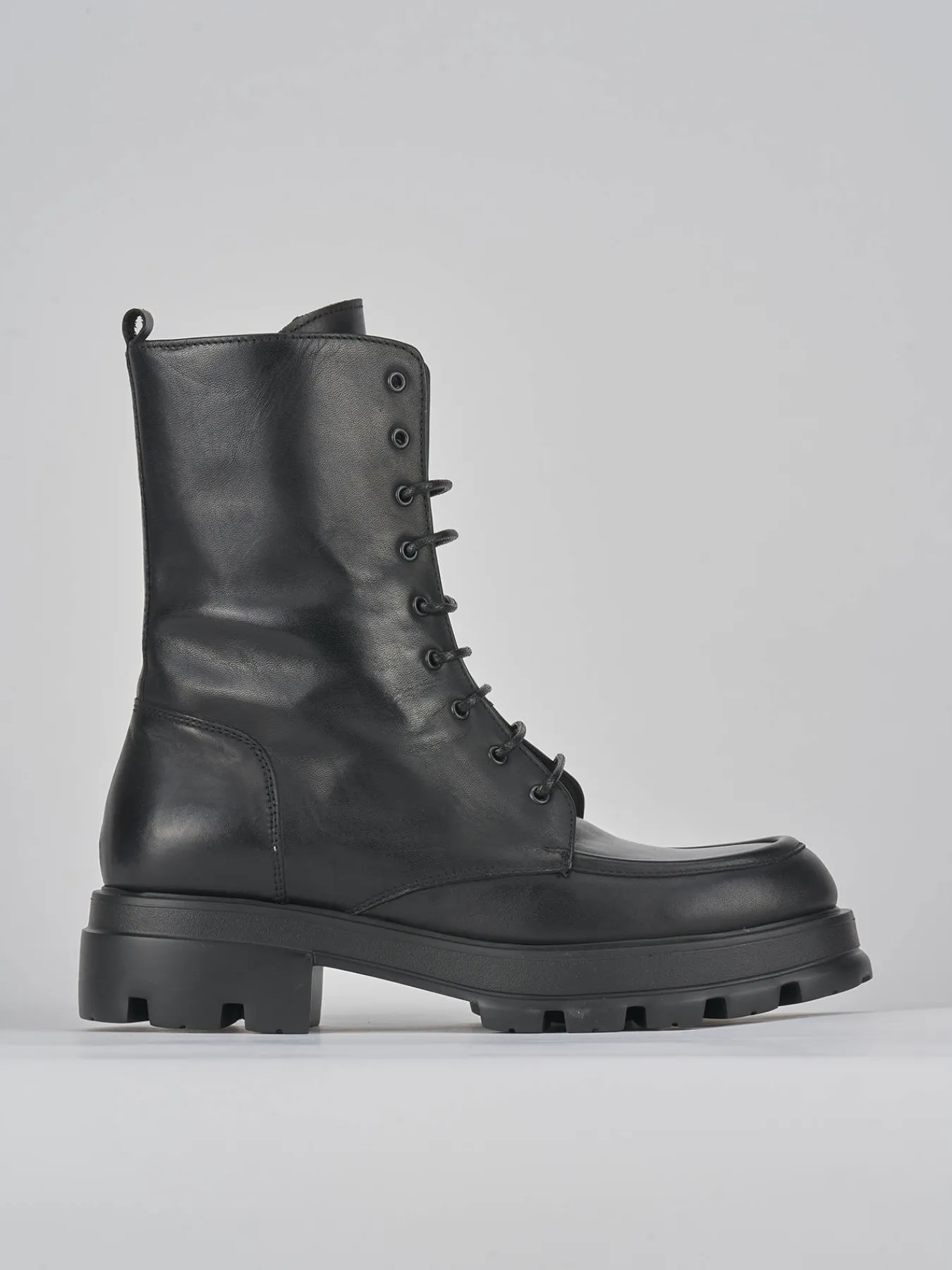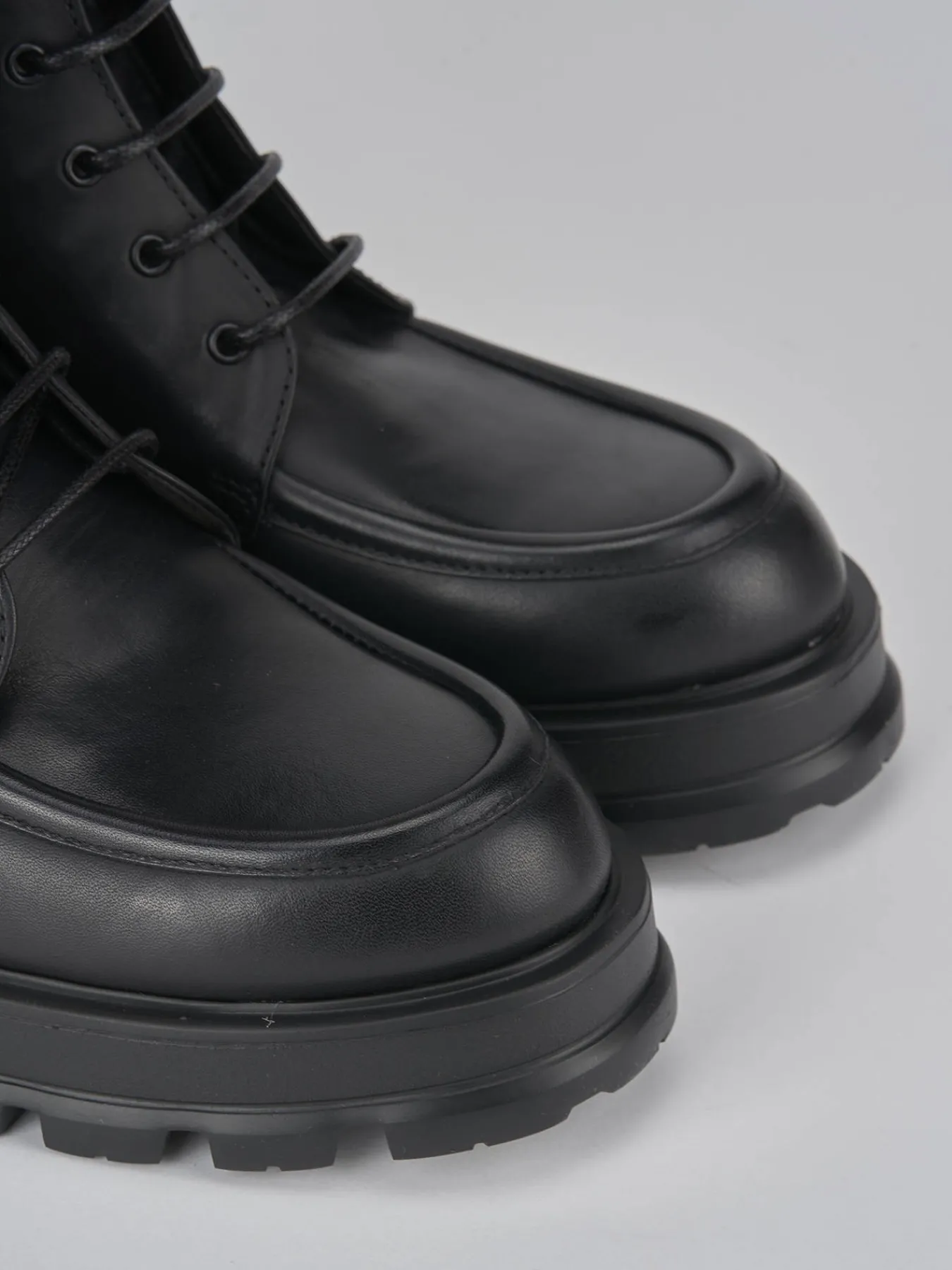 anfibio tacco 2 cm fondo in gomma e soletto interno in vera pelle. tomaia in morbida pelle, punta leggermente squadrata, cuciture visibili, lace con occhielli e comoda cerniera laterale per un look cool.