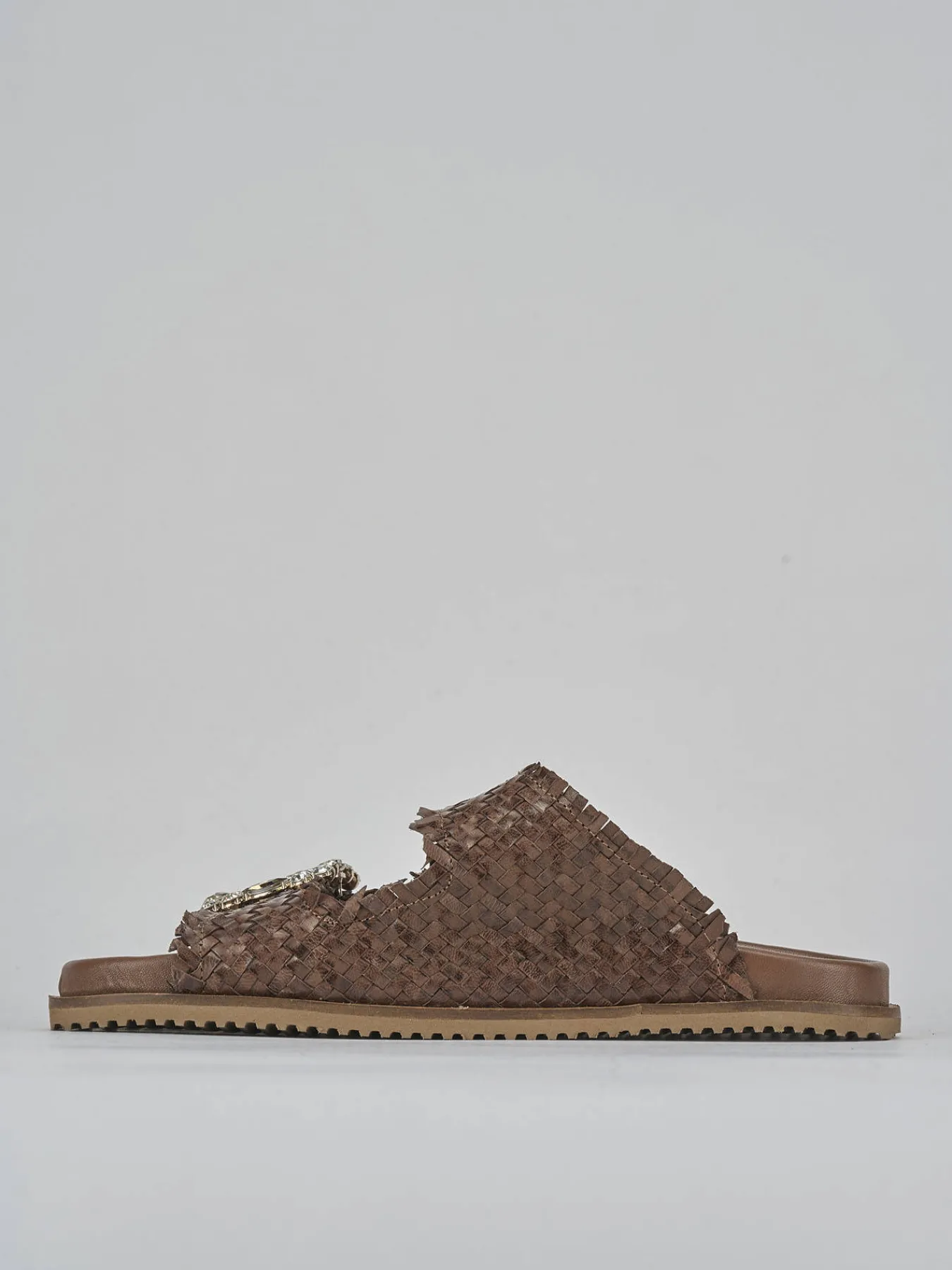 La tomaia è in morbida pelle finemente intrecciata, arricchita da due fasce con fibbie regolabili, che si adattano perfettamente al piede.