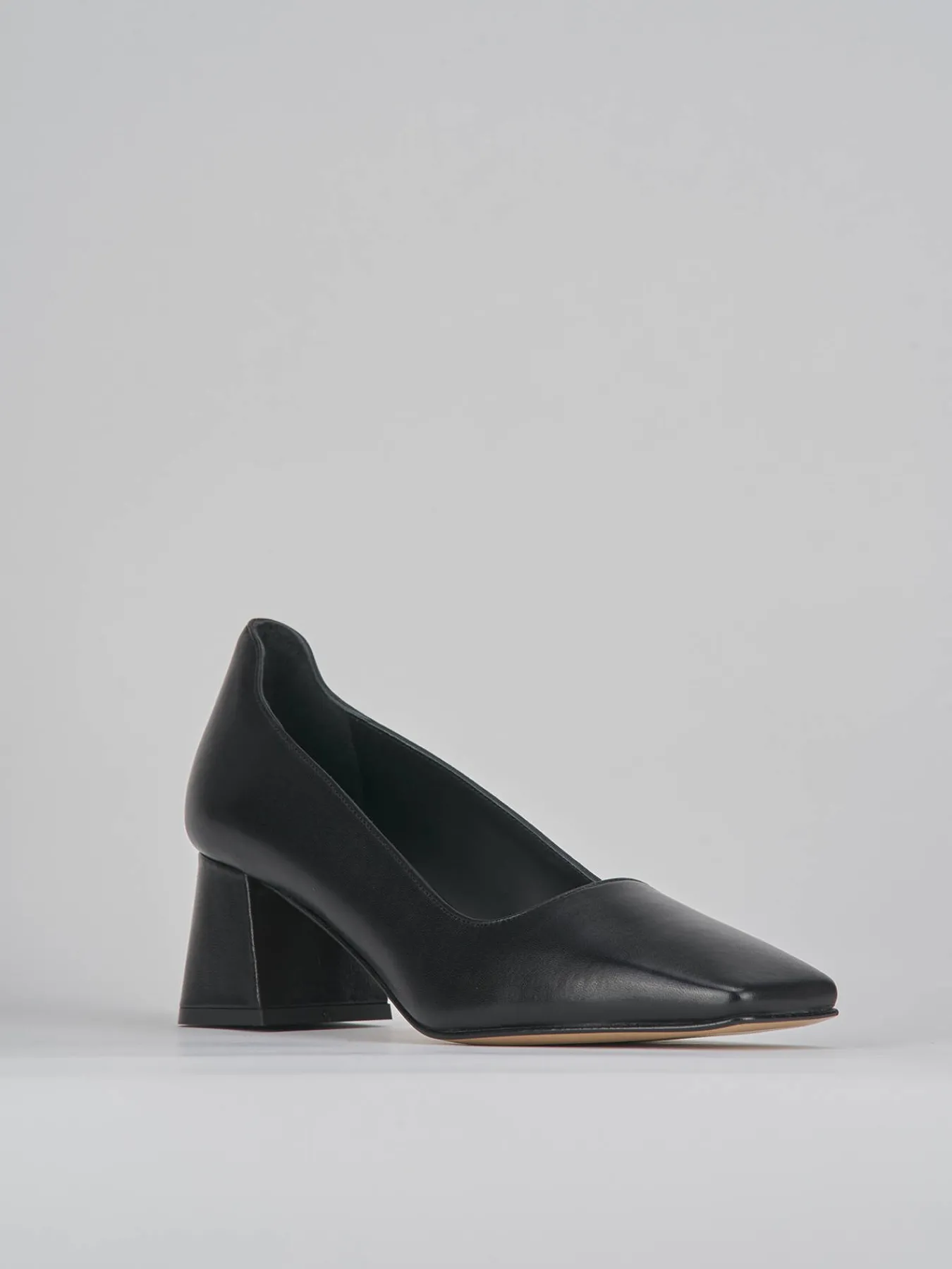 Decoltè tacco 5 cm fondo cuoio e soletto interno in vera pelle. Tomaia in morbida pelle nappata, punta squadrata, apertura squadrata sulla punta del piede, tallone leggermente più alto che protegge e tacco grosso per un look cool.