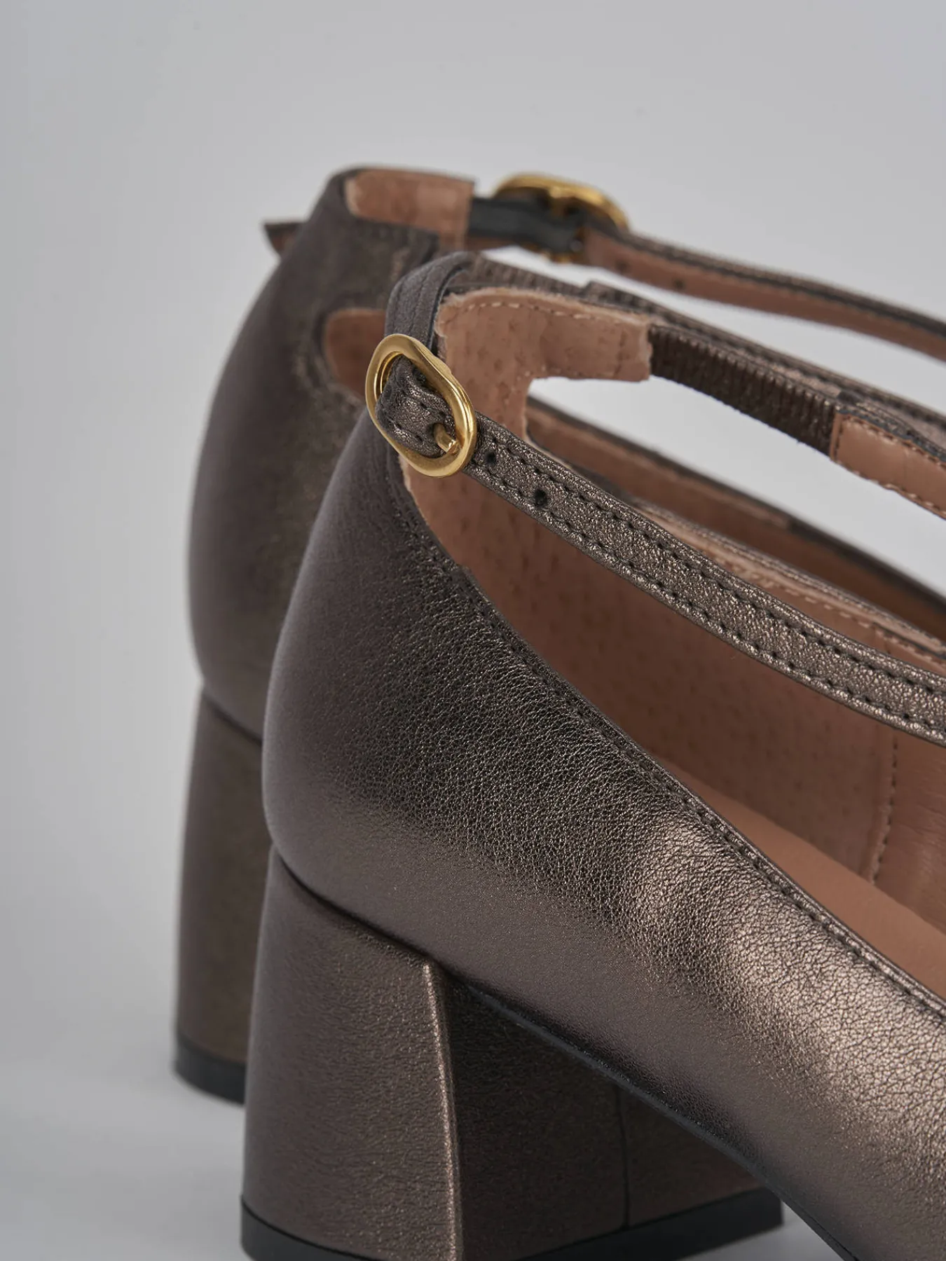bebe’ tacco 4.5 cm fondo in gomma e soletto interno in vera pelle. tomaia in morbida pelle laminata, punta squadrata, fascette con incrocio con fibbia regolabile e tacco grosso per una camminata comoda. perfetto con un vestito o una gonna.