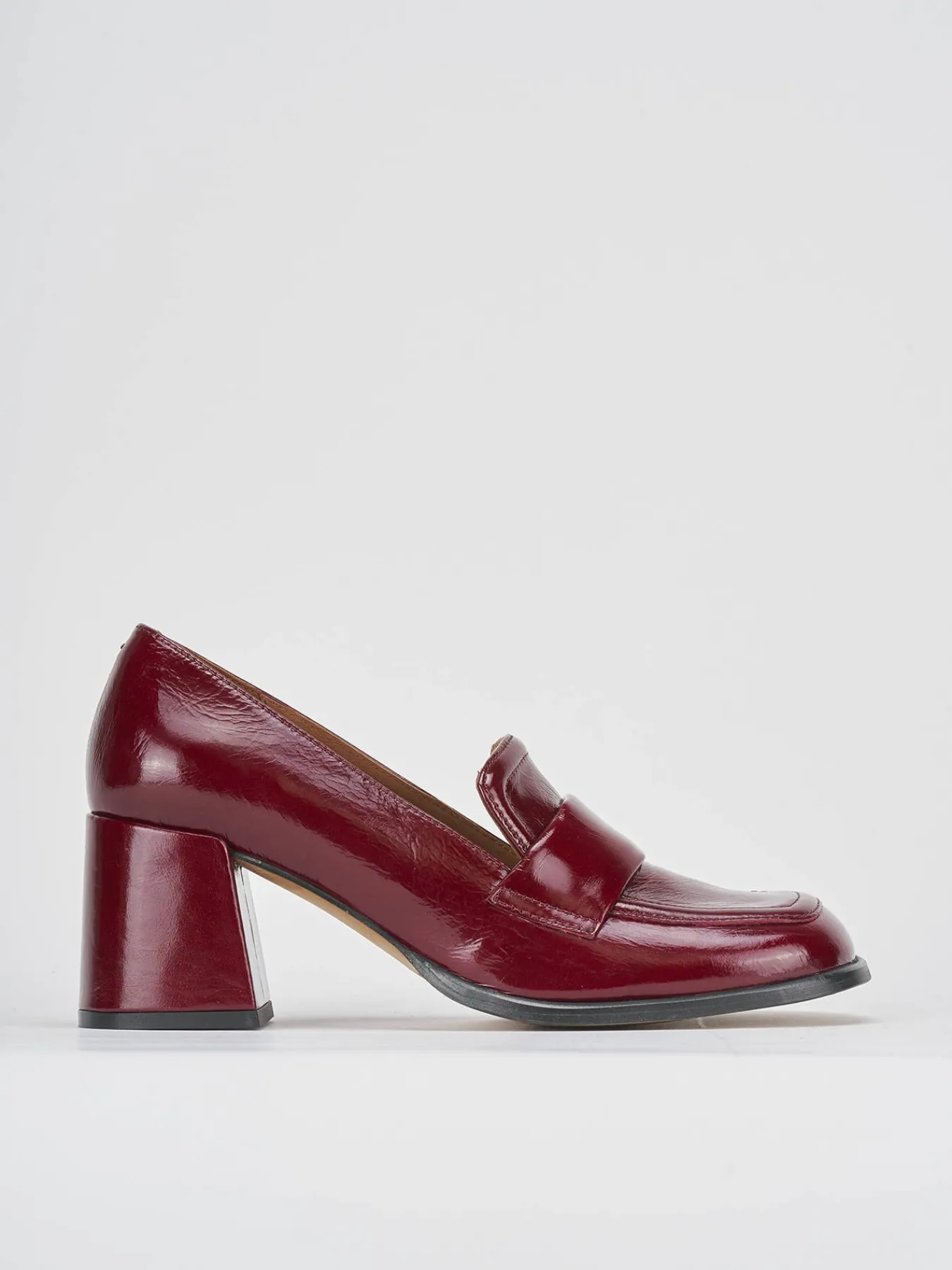 mocassino tacco 8 cm fondo in leggerissima gomma e soletto interno in vera pelle. tomaia in morbida pelle effetto verniciato, punta squadrata, cuciture a mano a vista, mascherina per un look sporty-chic.