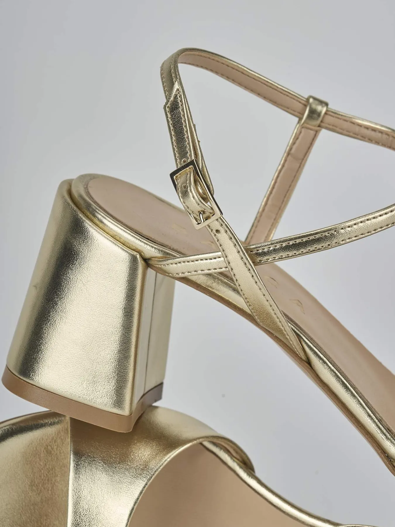 Sandalo tacco 9 cm fondo in leggerissima gomma e soletto interno in vera pelle. Tomaia in morbida pelle laminata, punta affsuolata, fascia unica con taglio cool, cinturino con fibbia regolabile e tacco grosso per il massimo del comfort.