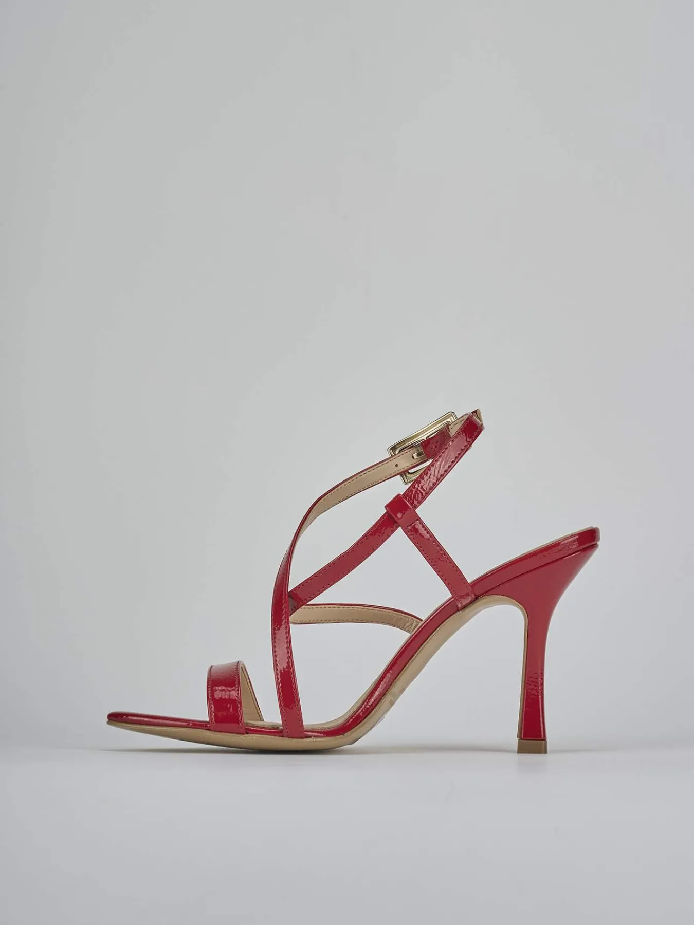 Sandalo tacco 9 cm fondo in leggerissima gomma e soletto interno in vera pelle. Tomaia in morbida pelle effetto verniciato, punta affusolata, fascia unica centrale, fasce oblique e cinturino con fibbia regolabile e tacco fino. Dal design ricercato, un must da avere nell’armadio.