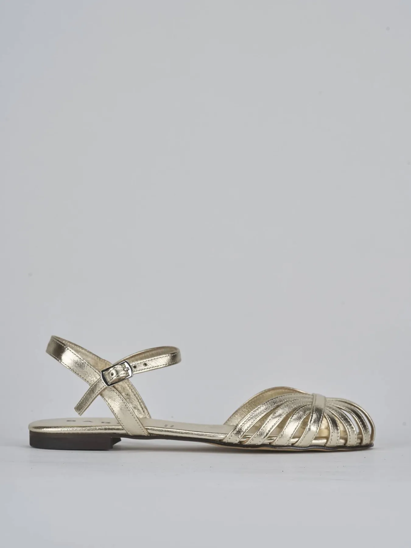 La tomaia è in morbida pelle laminata, arricchita da delicate fasce a ragnetto in punta che donano un tocco sofisticato.