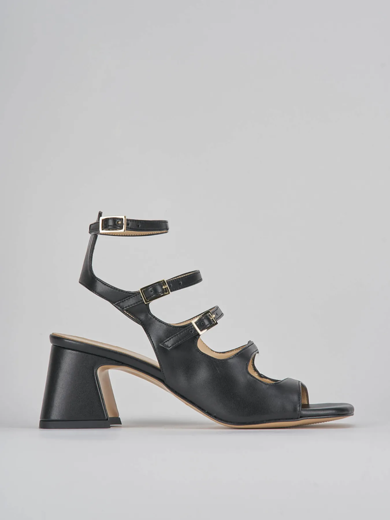 Sandalo tacco 6 cm, fondo in leggerissima gomma e soletto interno in vera pelle. Tomaia in morbida pelle nappata, punta squadrata, fibie con cinturini regolabili fino in caviglia, tacco grosso stabile e comodo per ogni giorno.