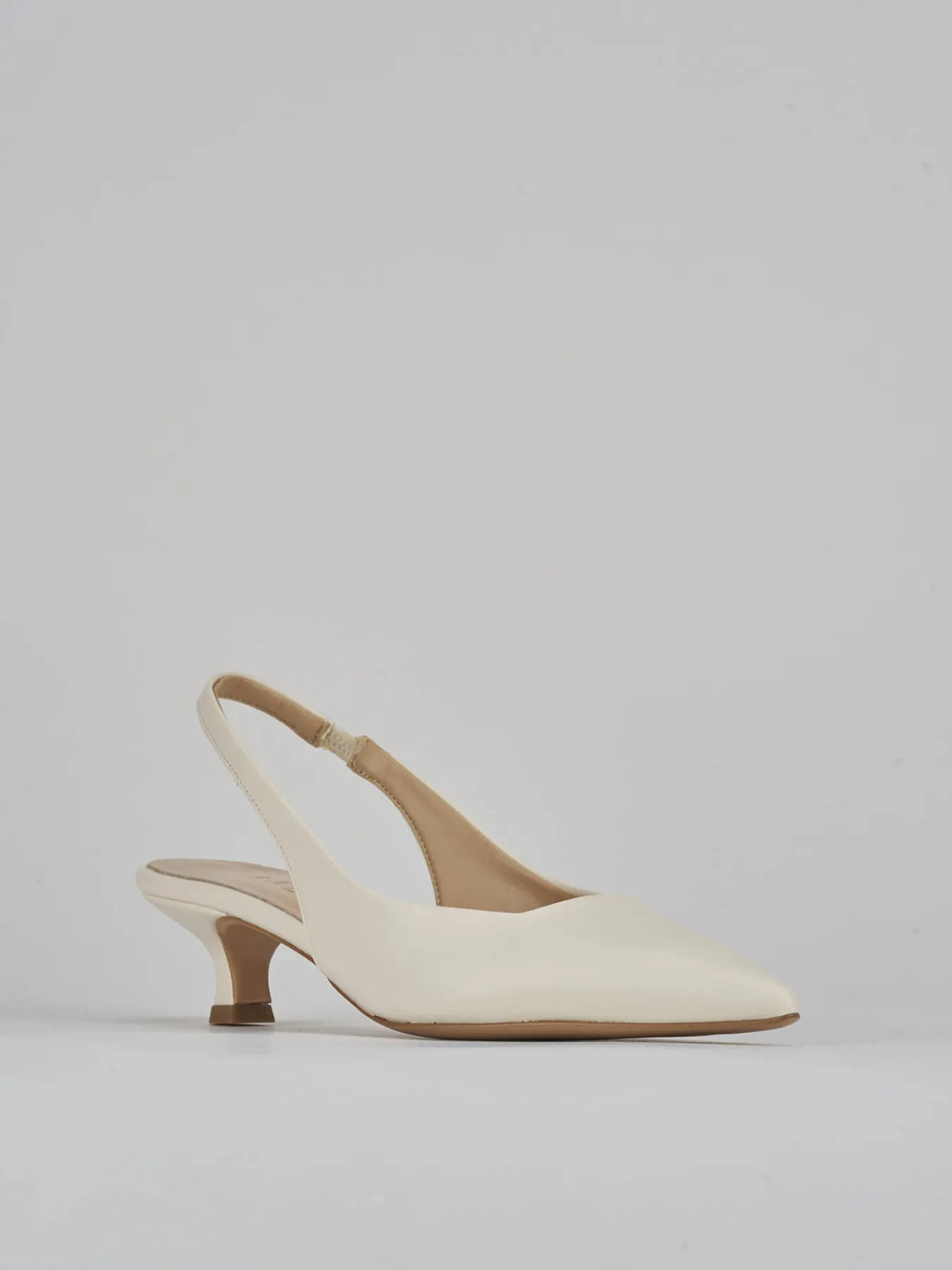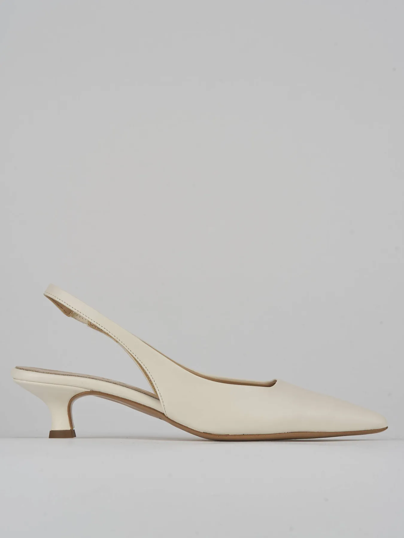 Slingback tacco 3 cm fondo in leggerissima gomma e soletto interno in vera pelle. tomaia in morbida pelle, punta sfilata, scollo squadrato, cinturino elasticizzato per il massimo del comfort e tacco rocchetto. perfetto e versatile con qualsiasi tuo outfit.